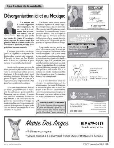 on en parle ensemble L%u2019INFO, novembre 2025 17D%u00e9sorganisation ici et au MexiqueLes 3 c%u00f4t%u00e9s de la m%u00e9dailleDaniel BoucherLa nature est %u00e0 la fois organis%u00e9e et d%u00e9sorganis%u00e9e. Si on regarde la croissance des plantes, des arbres, cela se fait un peu dans une sorte de chaos. Cependant, si on regarde le mouvement des plan%u00e8tes dans le syst%u00e8me solaire, les astronomes peuvent pr%u00e9dire avec pr%u00e9cision les mouvements.L%u2019humain, par d%u00e9faut, est d%u00e9sorganis%u00e9. Cela prend de la rigueur et de la discipline pour devenir organis%u00e9. L%u2019humain est aussi un %u00eatre d%u2019habitude. %u00c0 force de r%u00e9p%u00e9tition, il peut devenir organis%u00e9 plus facilement.Au niveau des gouvernements, la d%u00e9sorganisation peut rapidement devenir la norme car ce sont de grosses machines et le moindre %u00e9cart peut entra%u00eener des pertes de temps et des pertes d%u2019argent. Nous n%u2019avons qu%u2019%u00e0 regarder ce qui s%u2019est pass%u00e9 %u00e0 la SAAQ pour leur syst%u00e8me informatique.Avec mon exp%u00e9rience du march%u00e9 du travail, je confirme que la majorit%u00e9 des entreprises pourraient %u00eatre beaucoup mieux g%u00e9r%u00e9es. Je parie que vous %u00eates en mesure de d%u00e9tecter rapidement si un coll%u00e8gue ou un patron est organis%u00e9 tout le temps ou occasionnellement. Nous manquons souvent de temps et/ou d%u2019argent mais cela ne devrait pas emp%u00eacher d%u2019%u00eatre structur%u00e9 et organis%u00e9.Une de mes amies est une massoth%u00e9rapeute organis%u00e9e et elle est juge %u00e0 des championnats %u00e0 travers le monde. Elle organise aussi les championnats canadiens de massoth%u00e9rapie depuis quelques ann%u00e9es. Elle a accept%u00e9 de devenir juge au Mexique avec une coll%u00e8gue car cela se passait dans un tout inclus et qu%u2019elle pensait qu%u2019elle pouvait se reposer le reste du temps.%u00c0 sa grande surprise, arriv%u00e9e sur place, elle constate avec d%u00e9sarroi que celui qui a organis%u00e9 l%u2019%u00e9v%u00e8nement est un r%u00eaveur d%u00e9sorganis%u00e9. Il n%u2019y avait aucun horaire pour les comp%u00e9titeurs. Les juges n%u2019avaient que des crayons et des feuilles de papier vierge. Il n%u2019y avait rien pour identifier qui %u00e9tait participant, qui %u00e9tait visiteur et qui %u00e9tait juge. Il n%u2019y avait que quelques tables de massage et il aurait fallu qu%u2019il y en ait le double. Elle et sa coll%u00e8gue ont mis les bouch%u00e9es doubles b%u00e9n%u00e9volement pour aider l%u2019organisation %u00e0 sauver leur championnat.Il y a une diff%u00e9rence entre les r%u00eaveurs, les entrepreneurs et les gestionnaires. %u00c7a prend de l%u2019%u00e9nergie et des efforts pour faire le suivi des projets et des dossiers ad%u00e9quatement. Car si vous manquez de discipline et de rigueur pour vous-m%u00eame, ce sont les autres qui vont vous organiser ...ABRI D%u2019AUTOMOBILE TEMPORAIREUn abri d%u2019automobile temporaire peut %u00eatre install%u00e9 %u00e0 partir du 15 octobre et doit %u00eatre enlev%u00e9 au plus tard le 15 avril de l%u2019ann%u00e9e suivante.