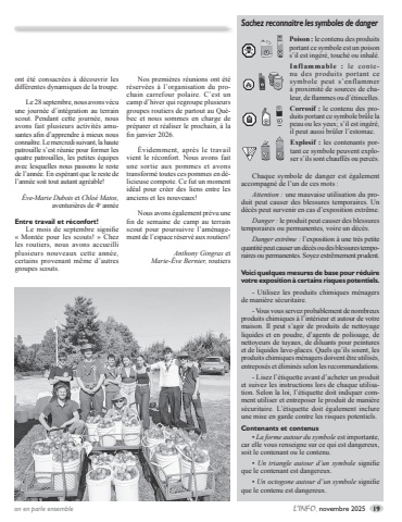 on en parle ensemble L%u2019INFO, novembre 2025 19ont %u00e9t%u00e9 consacr%u00e9es %u00e0 d%u00e9couvrir les diff%u00e9rentes dynamiques de la troupe. Le 28 septembre, nous avons v%u00e9cu une journ%u00e9e d%u2019int%u00e9gration au terrain scout. Pendant cette journ%u00e9e, nous avons fait plusieurs activit%u00e9s amusantes afin d%u2019apprendre %u00e0 mieux nous conna%u00eetre. Le mercredi suivant, la haute patrouille s%u2019est r%u00e9unie pour former les quatre patrouilles, les petites %u00e9quipes avec lesquelles nous passons le reste de l%u2019ann%u00e9e. En esp%u00e9rant que le reste de l%u2019ann%u00e9e soit tout autant agr%u00e9able!%u00c8ve-Marie Dubois et Chlo%u00e9 Matos,aventuri%u00e8res de 4e ann%u00e9eEntre travail et r%u00e9confort!Le mois de septembre signifie %u00ab Mont%u00e9e pour les scouts! %u00bb Chez les routiers, nous avons accueilli plusieurs nouveaux cette ann%u00e9e, certains provenant m%u00eame d%u2019autres groupes scouts. Nos premi%u00e8res r%u00e9unions ont %u00e9t%u00e9 r%u00e9serv%u00e9es %u00e0 l%u2019organisation du prochain carrefour polaire. C%u2019est un camp d%u2019hiver qui regroupe plusieurs groupes routiers de partout au Qu%u00e9bec et nous sommes en charge de pr%u00e9parer et r%u00e9aliser le prochain, %u00e0 la fin janvier 2026. %u00c9videmment, apr%u00e8s le travail vient le r%u00e9confort. Nous avons fait une sortie aux pommes et avons transform%u00e9 toutes ces pommes en d%u00e9licieuse compote. Ce fut un moment id%u00e9al pour cr%u00e9er des liens entre les anciens et les nouveaux! Nous avons %u00e9galement pr%u00e9vu une fin de semaine de camp au terrain scout pour poursuivre l%u2019am%u00e9nagement de l%u2019espace r%u00e9serv%u00e9 aux routiers!Anthony Gingras etMarie-%u00c8ve Bernier, routiersSachez reconnaitre les symboles de danger Poison : le contenu des produits portant ce symbole est un poison s%u2019il est ing%u00e9r%u00e9, touche%u0301 ou inhale%u0301. Inflammable : le contenu des produits portant ce symbole peut s%u2019enflammera%u0300 proximit%u00e9 de sources de chaleur, de flammes ou d%u2019%u00e9tincelles. Corrosif : le contenu des produits portant ce symbole br%u00fble la peau ou les yeux; s%u2019il est ing%u00e9r%u00e9, il peut aussi br%u00fbler l%u2019estomac. Explosif : les contenants portant ce symbole peuvent exploser s%u2019ils sont chauff%u00e9s ou perc%u00e9s. Chaque symbole de danger est %u00e9galement accompagne%u0301 de l%u2019un de ces mots : Attention : une mauvaise utilisation du produit peut causer des blessures temporaires. Un d%u00e9c%u00e8s peut survenir en cas d%u2019exposition extr%u00eame.Danger : le produit peut causer des blessures temporaires ou permanentes, voire un d%u00e9c%u00e8s. Danger extr%u00eame : l%u2019exposition a%u0300 une tr%u00e8s petite quantit%u00e9 peut causer un d%u00e9c%u00e8s ou des blessures temporaires ou permanentes. Soyez extr%u00eamement prudent. Voici quelques mesures de base pour r%u00e9duire votre exposition a%u0300 certains risques potentiels. - Utilisez les produits chimiques m%u00e9nagers de mani%u00e8re s%u00e9curitaire. - Vous vous servez probablement de nombreux produits chimiques a%u0300 l%u2019int%u00e9rieur et autour de votre maison. Il peut s%u2019agir de produits de nettoyage liquides et en poudre, d%u2019agents de polissage, de nettoyeurs de tuyaux, de diluants pour peintures et de liquides lave-glaces. Quels qu%u2019ils soient, les produits chimiques m%u00e9nagers doivent %u00eatre utilis%u00e9s, entrepos%u00e9s et %u00e9limin%u00e9s selon les recommandations. - Lisez l%u2019%u00e9tiquette avant d%u2019acheter un produit et suivez les instructions lors de chaque utilisation. Selon la loi, l%u2019%u00e9tiquette doit indiquer comment utiliser et entreposer le produit de mani%u00e8re s%u00e9curitaire. L%u2019%u00e9tiquette doit %u00e9galement inclure une mise en garde contre les risques potentiels. Contenants et contenus%u2022 La forme autour du symbole est importante, car elle vous renseigne sur ce qui est dangereux, soit le contenant ou le contenu. %u2022 Un triangle autour d%u2019un symbole signifie que le contenant est dangereux. %u2022 Un octogone autour d%u2019un symbole signifie que le contenu est dangereux.