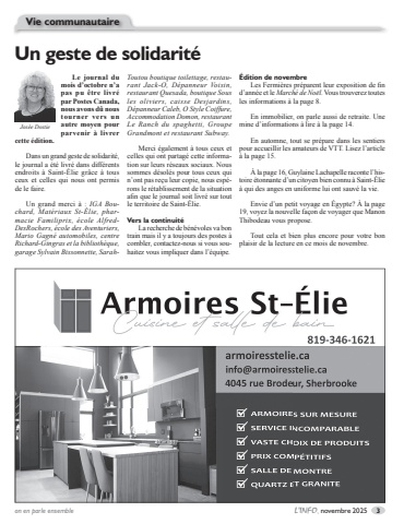 on en parle ensemble L%u2019INFO, novembre 2025 3Un geste de solidarit%u00e9Vie communautaireJos%u00e9e DostieLe journal du mois d%u2019octobre n%u2019a pas pu %u00eatre livr%u00e9 par Postes Canada, nous avons d%u00fb nous tourner vers un autre moyen pour parvenir %u00e0 livrer cette %u00e9dition.Dans un grand geste de solidarit%u00e9, le journal a %u00e9t%u00e9 livr%u00e9 dans diff%u00e9rents endroits %u00e0 Saint-%u00c9lie gr%u00e2ce %u00e0 tous ceux et celles qui nous ont permis de le faire. Un grand merci %u00e0 : IGA Bouchard, Mat%u00e9riaux St-%u00c9lie, pharmacie Familiprix, %u00e9cole AlfredDesRochers, %u00e9cole des Aventuriers, Mario Gagn%u00e9 automobiles, centre Richard-Gingras et la biblioth%u00e8que, garage Sylvain Bissonnette, SarahToutou boutique toilettage, restaurant Jack-O, D%u00e9panneur Voisin, restaurant Quesada, boutique Sous les oliviers, caisse Desjardins, D%u00e9panneur Caleb, O Style Coiffure, Accommodation Domon, restaurant Le Ranch du spaghetti, Groupe Grandmont et restaurant Subway.Merci %u00e9galement %u00e0 tous ceux et celles qui ont partag%u00e9 cette information sur leurs r%u00e9seaux sociaux. Nous sommes d%u00e9sol%u00e9s pour tous ceux qui n%u2019ont pas re%u00e7u leur copie, nous esp%u00e9rons le r%u00e9tablissement de la situation afin que le journal soit livr%u00e9 sur tout le territoire de Saint-%u00c9lie.Vers la continuit%u00e9La recherche de b%u00e9n%u00e9voles va bon train mais il y a toujours des postes %u00e0 combler, contactez-nous si vous souhaitez vous impliquer dans l%u2019%u00e9quipe.%u00c9dition de novembreLes Fermi%u00e8res pr%u00e9parent leur exposition de fin d%u2019ann%u00e9e et le March%u00e9 de No%u00ebl. Vous trouverez toutes les informations %u00e0 la page 8.En immobilier, on parle aussi de retraite. Une mine d%u2019informations %u00e0 lire %u00e0 la page 14.En automne, tout se pr%u00e9pare dans les sentiers pour accueillir les amateurs de VTT. Lisez l%u2019article %u00e0 la page 15.%u00c0 la page 16, Guylaine Lachapelle raconte l%u2019histoire %u00e9tonnante d%u2019un citoyen bien connu %u00e0 Saint-%u00c9lie %u00e0 qui des anges en uniforme lui ont sauv%u00e9 la vie.Envie d%u2019un petit voyage en %u00c9gypte? %u00c0 la page 19, voyez la nouvelle fa%u00e7on de voyager que Manon Thibodeau vous propose.Tout cela et bien plus encore pour votre bon plaisir de la lecture en ce mois de novembre.