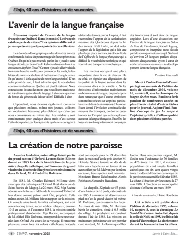 4 L%u2019INFO, novembre 2025 La vie %u00e0 Saint-%u00c9lie...L%u2019Info, 40 ans d%u2019histoires et de souvenirsL%u2019avenir de la langue fran%u00e7aise%u00cates-vous inquiet de l%u2019avenir de la langue fran%u00e7aise au Qu%u00e9bec? Dans le monde? Le fran%u00e7ais est-il en perte de vitesse? Les opinions diff%u00e8rent et je vous pr%u00e9sente quelques points de ces r%u00e9flexions.Les donn%u00e9es d%u00e9mographiques des derni%u00e8res ann%u00e9es confirment la baisse du pourcentage de francophones au Qu%u00e9bec. Et qui n%u2019a pas entendu parler du %u00ab joual %u00bb cette langue d%u00e9crite par Jean-Paul Desbiens dans son livre Les insolences du fr%u00e8re Untel? Ce mot %u00ab joual %u00bb d%u00e9crivait %u00e0 la fois notre bouche molle pour prononcer les mots, la faiblesse de notre vocabulaire et l%u2019utilisation d%u2019anglicismes. Et qu%u2019en est-il de la qualit%u00e9 de notre langue %u00e9crite? D%u2019un autre point de vue, il faut admettre que le vocabulaire couramment utilis%u00e9 au Qu%u00e9bec est plut%u00f4t restreint. Nous connaissons le sens des mots que nous lisons mais nous ne les utilisons gu%u00e8re dans le langage. Est-ce une question de honte, de g%u00eane ou de laisser-aller? Difficile %u00e0 dire.Cependant, nous devons %u00e9galement convenir que plusieurs enfants, m%u00eame tr%u00e8s jeunes, utilisent un vocabulaire beaucoup plus %u00e9labor%u00e9 que celui que nous connaissions au m%u00eame %u00e2ge. Les m%u00e9dias y sont certainement pour quelque chose mais c%u2019est surtout l%u2019attention port%u00e9e par leurs parents qui les encouragent %u00e0 utiliser des termes pr%u00e9cis. En plus, il faut reconna%u00eetre l%u2019apport de la scolarisation massive des Qu%u00e9b%u00e9cois depuis la fin des ann%u00e9es 1950. Enfin, on doit noter l%u2019apport de la l%u00e9gislation qui a fait une plus large place au fran%u00e7ais et les efforts de l%u2019Office de la langue fran%u00e7aise qui a diffus%u00e9 le vocabulaire technique et qui fournit une banque terminologique.Les m%u00e9dias occupent une place importante dans la vie de chacun. De ce c%u00f4t%u00e9, on signale une d%u00e9gradation de la qualit%u00e9 de la langue surtout dans les %u00e9missions dites %u00ab de vari%u00e9t%u00e9 %u00bb. Si les %u00e9missions d%u2019information maintiennent un bon niveau de langue, on peut cependant remarquer que d%u2019autres %u00e9missions sont moins strictes sur ce point, particuli%u00e8rement dans des %u00e9missions d%u2019humour. %u00c9tant donn%u00e9 l%u2019%u00e9volution continuelle des moyens %u00e9lectroniques, on doit se questionner sur l%u2019impact que cette explosion aura sur la langue fran%u00e7aise. En effet, les logiciels sont majoritairement con%u00e7us par des Am%u00e9ricains et sont donc de langue anglaise. Lors d%u2019une discussion sur l%u2019avenir de la langue fran%u00e7aise au Salon du livre de l%u2019an dernier, Raoul Duguay, compositeur et interpr%u00e8te, nous faisait part de son inqui%u00e9tude %u00e0 ce sujet. Sachant qu%u2019environ 25 langues parl%u00e9es disparaissent chaque ann%u00e9e, ayons %u00e0 c%u0153ur de veiller %u00e0 la survie ou mieux au d%u00e9veloppement de notre langue fran%u00e7aise.Pauline DussaultMerci %u00e0 Pauline Dussault d%u2019avoir partag%u00e9 un souvenir de l%u2019%u00e9dition du mois de d%u00e9cembre 2001, volume 16, num%u00e9ro 8, sous la chronique La langue de chez nous. Pauline a %u00e9crit pendant de nombreuses ann%u00e9es en plus d%u2019avoir r%u00e9alis%u00e9 d%u2019autres t%u00e2ches pour le journal. Aujourd%u2019hui, Pauline s%u2019occupe du jeu La soupe %u00e0 l%u2019alphabet qu%u2019elle a d%u2019ailleurs publi%u00e9 dans plusieurs %u00e9ditions pass%u00e9es.L%u2019Info, 40 ans d%u2019histoires et de souvenirsLa cr%u00e9ation de notre paroisseAvant sa fondation, notre village faisait partie du grand canton d%u2019Orford. Le nom Saint-%u00c9lie est donn%u00e9 en 1885 lors de la b%u00e9n%u00e9diction de la premi%u00e8re chapelle catholique, en l%u2019honneur du grand vicaire du dioc%u00e8se de Sherbrooke et missionnaire dans Orford, M. Alfred-%u00c9lie Dufresne.En 1881, M. Charles-%u00c9douard Millette vient s%u2019occuper des catholiques d%u2019Orford. Il est alors cur%u00e9 de Saint-Patrice-de-Magog. Le 20 mars 1882, Mgr Racine adresse une lettre aux fid%u00e8les de la mission d%u2019Orford et leur donne comme patron saint %u00c9lie, proph%u00e8te. Cette m%u00eame ann%u00e9e, M. Millette fait un rapport sur la mission. On compte alors trente familles catholiques, soit cent soixante-cinq %u00e2mes; aucun %u00e9difice religieux; environ 10 $ en caisse. %u00c0 l%u2019automne 1884, la mission semble pratiquement abandonn%u00e9e. Mgr Racine, accompagn%u00e9 de M. Alfred-%u00c9lie Dufresne, entreprend donc une tourn%u00e9e dans Orford. Au cours de ce voyage, il rencontre plusieurs, sinon tous les colons catholiques, lesquels sont convoqu%u00e9s pour le 29 d%u00e9cembre dans la maison d%u2019%u00e9cole pr%u00e8s de chez M. Doherty. S%u00e9ance tenante on d%u00e9cide de b%u00e2tir une chapelle sur un terrain de six acres offert par M. Mclver; par la m%u00eame occasion, trois syndics sont nomm%u00e9s : Messieurs Bruno Delafontaine, Alexis Pelchat et Alexandre Beaudette.La chapelle, 32 pieds sur 53 pieds, d%u2019une hauteur de 16 pieds, est construite en 1885. La mission est d%u00e9sormais sur pied et c%u2019est le grand vicaire lui-m%u00eame, M. Dufresne, qui en assume la charge. Au mois de mai 1886, M. Dufresne b%u00e9nit le cimeti%u00e8re, situ%u00e9 %u00e0 0,5 mille du village. Le presbyt%u00e8re est construit durant l%u2019%u00e9t%u00e9 de 1886. La mission est maintenant pr%u00eate %u00e0 recevoir son premier cur%u00e9 r%u00e9sidant, M. J.-Dominique-Olier Godin. Dans son premier rapport, M. Godin note l%u2019existence de 70 familles ou 426 %u00e2mes. En 1901, il inscrira : population de cent vingts familles catholiques ou six cent quatre-vingts %u00e2mes. Le d%u00e9cret d%u2019%u00e9rection canonique de