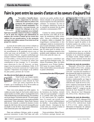 8 L%u2019INFO, novembre 2025 La vie %u00e0 Saint-%u00c9lie...Novembre s%u2019installe doucement, emportant les derniers reflets dor%u00e9s dans les arbres et la promesse des premi%u00e8res neiges dans les brumes matinales. Les journ%u00e9es raccourcissent, on ressort les %u00e9charpes et on r%u00eave de finir sa journ%u00e9e en se r%u00e9chauffant tous ensemble autour d%u2019un foyer cr%u00e9pitant. C%u2019est le mois des mijot%u00e9s qui embaument la maison, des recettes d%u2019antan qu%u2019on ressort des cahiers de nos grands-m%u00e8res, et des moments partag%u00e9s entre amies autour d%u2019un tricot ou d%u2019un projet de couture.Le mois de novembre nous invite %u00e0 ralentir et %u00e0 c%u00e9l%u00e9brer la m%u00e9moire et la transmission. Le 1ernovembre, nous soulignons la Toussaint, moment de recueillement et de gratitude envers ceux et celles qui nous ont pr%u00e9c%u00e9d%u00e9s. Le 2 novembre, nous reculons l%u2019heure : un geste symbolique qui marque vraiment l%u2019entr%u00e9e dans la saison hivernale. Le 8 novembre, c%u2019est la Journ%u00e9e des anciens combattants autochtones, l%u2019occasion de saluer leur contribution et leur courage. Le 11 novembre, nous observons le Jour du Souvenir, en hommage %u00e0 tous les anciens combattants. Enfin, le 20 novembre, la Journ%u00e9e nationale de l%u2019enfant nous rappelle l%u2019importance de prot%u00e9ger et de c%u00e9l%u00e9brer les plus jeunes, porteurs de l%u2019avenir.Un March%u00e9 de No%u00ebl plein de surprises!Notre Cercle, qui compte maintenant plus de 80 membres, se pr%u00e9pare activement %u00e0 notre March%u00e9 de No%u00eblainsi que notre exposition de fin d%u2019ann%u00e9e, qui se tiendront les 29 et 30 novembre au centre communautaire Richard-Gingras. Nous vous avons pr%u00e9par%u00e9 une belle surprise : la vedette sera notre Sapin de No%u00ebl textile, r%u00e9alis%u00e9 tout en carr%u00e9s tricot%u00e9s au crochet, gr%u00e2ce %u00e0 un programme de la Ville de Sherbrooke et son aide financi%u00e8re. Nos membres ont tricot%u00e9 depuis l%u2019%u00e9t%u00e9 dernier plus de 750 carr%u00e9s grandm%u00e8re (Granny Square) que nous avons ensuite assembl%u00e9s patiemment. Notre pr%u00e9sidente, Marie-Paule Samson aid%u00e9e de son conjoint, a construit la structure et notre %u00e9quipe du club tricot a fait un travail remarquable pour accomplir ce tour de force. Soyez toutes chaleureusement remerci%u00e9es pour votre implication!Dans une ambiance f%u00e9%u00e9rique, petits et grands pourront rencontrer le p%u00e8re No%u00ebl dans une salle Cercle de Fermi%u00e8resFaire le pont entre les savoirs d%u2019antan et les saveurs d%u2019aujourd%u2019huiNadia Nad%u00e8ger%u00e9serv%u00e9e aux petits, profiter de collations chaudes et de gourmandises maison inspir%u00e9es de notre patrimoine culinaire. La musique, les rires et les %u00e9changes chaleureux feront de ce march%u00e9 un moment fort de notre calendrier communautaire 2025.Comme les ann%u00e9es pr%u00e9c%u00e9dentes, nous devrions vous offrir de la musique, de nombreuses tables artisanales : bijoux et colifichets, tuques et mitaines, ch%u00e2les et chandails. De magnifiques courtepointes et des catalognes cr%u00e9atives avoisineront les jeux et jouets artisanaux, toutes sortes de linge de maison plus beaux les uns que les autres pour la cuisine ou le bain, des cosm%u00e9tiques naturels et des produits sant%u00e9 originaux, des %u0153uvres d%u2019art et des cartes de v%u0153ux, etc.Vous pourrez contribuer aux causes qui nous tiennent %u00e0 c%u0153ur : les chiens d%u2019assistance Mira, les b%u00e9b%u00e9s pr%u00e9matur%u00e9s avec Pr%u00e9ma Qu%u00e9bec, OLO pour les jeunes familles, etc. Votre co%u00fbt d%u2019entr%u00e9e sera un don pour le panier alimentaire. Le nouveau livre des CFQ est paru!Le tout nouveau livre des Cercles de fermi%u00e8res du Qu%u00e9bec, intitul%u00e9 %u00ab Qu%u2019est-ce qu%u2019on mange? %u00bb, est paru le 15 octobre 2025 pour souligner le 110e anniversaire de l%u2019organisation. Ce recueil, qui revisite avec amour les recettes embl%u00e9matiques du Qu%u00e9bec - du pouding ch%u00f4meur au p%u00e2t%u00e9 chinois - t%u00e9moigne du lien vivant entre nos savoirs d%u2019antan et les saveurs d%u2019aujourd%u2019hui. Notre pr%u00e9sidente, Marie Parent, a d%u2019ailleurs partag%u00e9 durant une %u00e9mission Curieux B%u00e9gin sur T%u00e9l%u00e9Qu%u00e9bec sa recette traditionnelle du fameux rago%u00fbt de pattes et de boulettes (pattes de cochon et jarret de porc), v%u00e9ritable symbole de r%u00e9confort d%u2019automne.Souhaitons-nous un mois de novembre tout en douceur, en chaleur humaine et en cr%u00e9ativit%u00e9 partag%u00e9e, o%u00f9 chaque recette, chaque maille et chaque sourire tisseront encore plus fort le lien qui unit notre communaut%u00e9.Activit%u00e9s du mois de novembreMercredi 5, (9 h %u00e0 12 h) : club de tricot. Jeudi 6, (9 h %u00e0 12 h) : couture, confection d%u2019un porte-plat. Mardi 11, (18 h 30) : rencontre des membres et d%u00e9voilement du sapin en carr%u00e9s tricot%u00e9s. Mercredi 12, (9 h %u00e0 12 h) : club de couture. Jeudi 13, (9 h %u00e0 12 h) : broderie traditionnelle sur linge %u00e0 vaisselle. Mercredi 19, (9 h %u00e0 12 h) : club de tricot. Jeudi 20, (9 h %u00e0 12 h) : tricot, cr%u00e9ation d%u2019une boule de No%u00ebl. Mercredi 26, (9 h %u00e0 12 h) : club de broderie. Jeudi 27 : cong%u00e9 en vue du March%u00e9 de No%u00ebl. Samedi 29, (10 h %u00e0 16 h) : March%u00e9 de No%u00ebl. Dimanche 30, (10 h %u00e0 16 h) : March%u00e9 de No%u00ebl.Activit%u00e9s du mois de d%u00e9cembreLundi 1er, (8 h 45): d%u00e9jeuner CFQ au Coco Frutti Rock Forest. Mercredi 3, (9 h %u00e0 12 h) : club de tricot. Jeudi 4, (9 h %u00e0 12 h) : atelier cr%u00e9ativit%u00e9, fabrication d%u2019%u00e9tiquettes de cadeaux par impression sur plaques de gel.29 et 30novembre