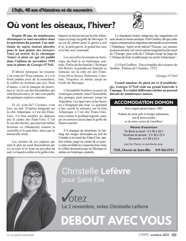 on en parle ensemble L%u2019INFO, octobre 2025 11L%u2019Info, 40 ans d%u2019histoires et de souvenirsO%u00f9 vont les oiseaux, l%u2019hiver?Depuis 40 ans, de nombreuses chroniques se sont succ%u00e9d%u00e9es dans les parutions du journal. Une multitude de sujets %u00e9taient abord%u00e9s pour le bon plaisir des lecteurs. Voici un article de la chronique Nature et plein air qui %u00e9t%u00e9 publi%u00e9 dans l%u2019%u00e9dition de novembre 1995 sous la plume de Georges O%u2019Neil. D%u2019abord, pourquoi les oiseaux s%u2019en vont-ils? Pour certains, il y a le froid (m%u00eame avec de la nourriture, le colibri ne resterait pas ici). Pour d%u2019autres, c%u2019est le manque de nourriture (c%u2019est le cas des hirondelles qui sont insectivores). Je vais vous parler de quelques esp%u00e8ces connues.Et o%u00f9 vont-ils? Certains vont loin, au sud. D%u2019autres %u00e9migrent sur la c%u00f4te Atlantique, %u00e0 l%u2019est des %u00c9tatsUnis. Un bon nombre ne d%u00e9passe pas le centre des %u00c9tats-Unis. C%u2019est le cas des merles, qui peuvent m%u00eame hiverner ici (Montr%u00e9al) comme la corneille et le geai bleu, ainsi que la tourterelle triste.Les oiseaux de ces esp%u00e8ces qui sont le plus au nord descendront par ici, et ceux d%u2019ici iront un peu plus au sud. Le huard %u00e0 collier et le gr%u00e8be %u00e0 bec bigarr%u00e9 se retrouvent sur la c%u00f4te Atlantique et jusqu%u2019au golfe du Mexique. Il en est de m%u00eame pour le garrot %u00e0 %u0153il d%u2019or, le petit garrot, le grand bec-scie et le bec-scie couronn%u00e9.Les sarcelles hivernent en Am%u00e9rique du Sud et en Am%u00e9rique centrale. Partie du fin fond de l%u2019Arctique (%u00eele Bylot), la grande oie blanche se ramasse sur la c%u00f4te est des %u00c9tatsUnis (New-Jersey, Delaware, Caroline, Virginie) et m%u00eame jusqu%u2019au Golfe du Mexique.L%u2019hirondelle bicolore va aussi en Am%u00e9rique centrale, mais l%u2019hirondelle des granges peut pousser jusqu%u2019en Argentine. Les %u00e9perviers et les buses ne s%u2019%u00e9loignent pas trop. Le go%u00e9land %u00e0 bec cercl%u00e9 se retrouve sur la c%u00f4te Atlantique %u00e0 l%u2019est des %u00c9tats-Unis, tout comme le go%u00e9land argent%u00e9, mais qu%u2019on retrouve aussi dans le golfe du Saint-Laurent.S%u2019il manque de nourriture, le harfang des neiges descendra au sud du Canada et au nord des %u00c9tats-Unis, parfois m%u00eame jusqu%u2019au centre de ce pays. Le pluvier kildir ne va pas tr%u00e8s loin, mais le colibri descend jusqu%u2019au Mexique et m%u00eame en Am%u00e9rique centrale.Le champion toutes cat%u00e9gories des migrations est sans doute la sterne arctique. Earl Godfrey dit que cette esp%u00e8ce entreprend sa migration automnale en traversant l%u2019Atlantique. Apr%u00e8s avoir atteint l%u2019Europe, ces oiseaux poursuivent leur vol vers le sud en longeant la c%u00f4te ouest de l%u2019Europe, puis celle de l%u2019Afrique jusqu%u2019au large de l%u2019Afrique du Sud, et enfin jusqu%u2019au cercle Antarctique 1.(1) Earl Godfrey : Encyclop%u00e9die des oiseaux du Qu%u00e9bec, %u00c9dition de l%u2019homme, 1972.Georges O%u2019NeilGrand amateur de plein air et d%u2019ornithologie, Georges O%u2019Neil %u00e9tait un grand b%u00e9n%u00e9vole %u00e0 l%u2019%u00e9poque. Il a r%u00e9alis%u00e9 diff%u00e9rentes t%u00e2ches au journal durant de nombreuses ann%u00e9es.