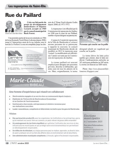 12 L%u2019INFO, octobre 2025 La vie %u00e0 Saint-%u00c9lie...Rue du PaillardG%u00e9rard Cot%u00e9 et Jean-Marie DuboisLes toponymes de Saint-%u00c9lieCette rue fait partie du projet de d%u00e9veloppement domiciliaire d%u2019Adjutor Lessard, accept%u00e9 en 1965 par le conseil municipal de Rock Forest.Une premi%u00e8re partie de la rue est construite en 1966 de la rue Kennedy Nord (Henri-Labonne depuis 2006) jusqu%u2019%u00e0 l%u2019intersection ouest de la rue Adjutor sous le nom de Le Paillard. La rue est compl%u00e9t%u00e9e jusqu%u2019au chemin du 6e Rang Nord (chemin Godin depuis 2006) en 1971-1972. Le toponyme n%u2019est officialis%u00e9 par la Commission de toponymie du Qu%u00e9bec en 1998 sous le nom de rue Paillard, semble-t-il pour d%u00e9signer un patronyme. Comme le Comit%u00e9 de toponymie de la Ville de Sherbrooke n%u2019a trouv%u00e9 aucune personne de ce patronyme %u00e0 rappeler le souvenir, le conseil municipal de Sherbrooke d%u00e9cide de modifier en 2012 le toponyme pour l%u2019actuel. La modification est officialis%u00e9e l%u2019ann%u00e9e suivante par la Commission de toponymie du Qu%u00e9bec.Le terme paillard est souvent employ%u00e9 pour d%u00e9signer une personne grivoise, dissolue et d%u00e9bauch%u00e9e, qui aime jouir de tous les plaisirs de la vie. Mais, originellement, le terme d%u00e9signait plut%u00f4t un vagabond qui couche sur la paille.Le terme d%u00e9rive du latin palea(paille) qui a donn%u00e9, dans le latin m%u00e9di%u00e9val, l%u2019anthroponyme paliardus au XIe si%u00e8cle puis paillardus au XIIe si%u00e8cle. Le terme est francis%u00e9 au XIIIe si%u00e8cle.Photo : http://www.douzemillekilometres.blogspot.com/Personne qui couche sur la paille