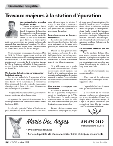 14 L%u2019INFO, octobre 2025 La vie %u00e0 Saint-%u00c9lie...L%u2019immobilier d%u00e9mystifi%u00e9Travaux majeurs %u00e0 la station d%u2019%u00e9purationS%u00e9bastien LabrieUne modernisation attendue depuis des ann%u00e9esComme vous pouvez l'avoir lu dans mon article du mois d'avril, la question de la gestion des eaux us%u00e9es pour le secteur de Saint-%u00c9lie me touche particuli%u00e8rement. Je vous avais mentionn%u00e9 qu'en f%u00e9vrier, la municipalit%u00e9 avait %u00e9mis un moratoire qui stoppait toute nouvelle demande li%u00e9e aux stations d'%u00e9puration. Un all%u00e9gement a %u00e9t%u00e9 annonc%u00e9 en juin, mais l'arrondissement de Saint-%u00c9lie d'Orford n%u2019a pas %u00e9t%u00e9 %u00e9pargn%u00e9.Ce probl%u00e8me est connu depuis longtemps. D%u00e9j%u00e0 en 2019, La Tribune rapportait que plusieurs millions de dollars seraient n%u00e9cessaires pour moderniser les installations. Or, ces investissements ont %u00e9t%u00e9 constamment repouss%u00e9s. Le 2 septembre dernier, la Ville a finalement officialis%u00e9 le lancement des travaux de mise %u00e0 niveau de la station d%u2019%u00e9puration de Saint-%u00c9lie.Un chantier de huit mois pour moderniser les infrastructuresLes travaux d%u00e9but%u00e9s le 2 septembre s%u2019%u00e9chelonneront sur huit mois, avec une pause de deux mois durant l%u2019hiver. Autoris%u00e9e par le minist%u00e8re de l%u2019Environnement, de la lutte contre les changements climatiques, de la faune et des parcs, l%u2019intervention vise deux objectifs principaux :-Respecter les nouveaux crit%u00e8res gouvernementaux en mati%u00e8re de rejets d%u2019eaux us%u00e9es.-Augmenter la capacit%u00e9 de traitement de la station pour mettre fin au moratoire impos%u00e9 depuis l%u2019automne 2017.Le chantier pr%u00e9voit l%u2019ajout d%u2019%u00e9quipements plus performants et la construction d%u2019un nouveau b%u00e2timent pour les abriter. %u00c0 terme, la capacit%u00e9 de la station sera tripl%u00e9e, une am%u00e9lioration majeure qui permettra de r%u00e9pondre %u00e0 la croissance du secteur.Fonctionnement et impacts temporairesLa station de Saint-%u00c9lie compte actuellement trois bassins de traitement qui re%u00e7oivent les eaux us%u00e9es g%u00e9n%u00e9r%u00e9es par les r%u00e9sidents du secteur.Durant les trois premiers mois des travaux, un bassin devra %u00eatre isol%u00e9 pour r%u00e9aliser les am%u00e9nagements n%u00e9cessaires. Les deux autres bassins continueront d%u2019assurer le traitement avant le rejet %u00e0 l%u2019environnement.Si la Ville assure que la qualit%u00e9 du service sera maintenue, certains inconv%u00e9nients seront %u00e0 pr%u00e9voir : du bruit li%u00e9 %u00e0 la machinerie et une augmentation de la circulation de camions autour de la station. Ces perturbations devraient toutefois demeurer limit%u00e9es et temporaires.Une station strat%u00e9gique pour SherbrookeLa station d%u2019%u00e9puration de Saint%u00c9lie est la quatri%u00e8me en importance parmi les installations de la Ville de Sherbrooke. Sa modernisation repr%u00e9sente donc un enjeu de taille, tant pour l%u2019environnement que pour le d%u00e9veloppement immobilier.Depuis plusieurs ann%u00e9es, cette contrainte a compliqu%u00e9 les projets de toute nouvelle construction r%u00e9sidentielle dans le secteur. Cette situation a ralenti la croissance locale et frein%u00e9 les projets d%u2019am%u00e9nagement. Avec l%u2019ach%u00e8vement des travaux, la reprise des projets immobiliers pourra %u00eatre envisag%u00e9e. Cela pourrait stimuler l%u2019arriv%u00e9e de nouveaux projets r%u00e9sidentiels et commerciaux et redonner un %u00e9lan %u00e0 l%u2019attractivit%u00e9 de l%u2019arrondissement.Un tournant attendu par les citoyensPour les habitants de Saint-%u00c9lie, cette annonce marque une %u00e9tape importante. Apr%u00e8s plusieurs reports, les travaux se concr%u00e9tisent enfin. Bien que les prochains mois apportent leur lot de d%u00e9sagr%u00e9ments, les b%u00e9n%u00e9fices %u00e0 long terme sont clairs :- Une infrastructure adapt%u00e9e aux normes actuelles.- Une capacit%u00e9 de traitement suffisante pour accompagner le d%u00e9veloppement futur.- La possibilit%u00e9 de lever le moratoire qui paralyse le secteur.Le lancement de ce chantier redonne confiance aux r%u00e9sidents et aux acteurs immobiliers. Plus qu%u2019une simple mise %u00e0 niveau technique, il s%u2019agit d%u2019un projet structurant qui permettra %u00e0 Saint-%u00c9lie de regarder vers l%u2019avenir avec optimisme.