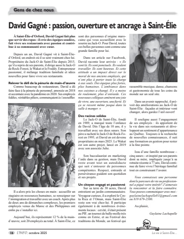 16 L%u2019INFO, octobre 2025 La vie %u00e0 Saint-%u00c9lie...David Gagn%u00e9 : passion, ouverture et ancrage %u00e0 Saint-%u00c9lieGens de chez nous%u00c0 Saint-%u00c9lie-d%u2019Orford, David Gagn%u00e9 fait plus que servir des repas : il cr%u00e9e des %u00e9quipes soud%u00e9es, fait vivre ses restaurants avec passion et contribue %u00e0 sa communaut%u00e9 avec c%u0153ur.Depuis un an, David Gagn%u00e9 vit %u00e0 Saint-%u00c9lied%u2019Orford, un endroit o%u00f9 il se sent vraiment chez lui. Propri%u00e9taire du Jack-O de Saint-%u00c9lie depuis 2015, qu%u2019il a repris de ses parents, il dirige aussi le Jack-O de Rock-Forest, le Waka%u00ef et le Freddy. Entrepreneur passionn%u00e9, il m%u00e9lange tradition familiale et id%u00e9es nouvelles pour faire vivre ses restaurants.Relever le d%u00e9fi de la p%u00e9nurie de main-d%u2019%u0153uvreComme beaucoup de restaurateurs, David a d%u00fb faire face %u00e0 la p%u00e9nurie de personnel, amorc%u00e9e en 2018 et accentu%u00e9e avec la pand%u00e9mie en 2020. Ses employ%u00e9s fid%u00e8les, v%u00e9ritables piliers, commen%u00e7aient %u00e0 s%u2019essouffler.Il a alors pris les choses en main : accueillir un stagiaire en ressources humaines, se renseigner sur l%u2019immigration et travailler avec un coach. Apr%u00e8s plus de deux ans de d%u00e9marches complexes, les premiers employ%u00e9s venus du Maroc et des Philippines ont enfin pu s%u2019installer ici.Aujourd%u2019hui, ils repr%u00e9sentent 12 % de la maind%u2019%u0153uvre, soit 20 employ%u00e9s au total. %u00c0 Saint-%u00c9lie, ce sont des personnes d%u2019origine marocaine qui vous accueillent avec le sourire au Jack-O. Pour David, toutes ces belles personnes sont comme une grande famille pour lui.Dans un article sur Facebook, David raconte leur arriv%u00e9e : %u00ab Ils sont l%u00e0. Ils sont ponctuels. Ils veulent travailler. Ils sont heureux. Et cette attitude a un impact direct sur le moral de nos anciens employ%u00e9s, qui n%u2019ont plus %u00e0 porter toute la charge %u00e0 eux seuls. Des %u00e9quipes plus fortes, plus humaines. L%u2019ambiance dans nos cuisines a chang%u00e9. Il y a moins de roulement, plus d%u2019entraide. Ces nouveaux coll%u00e8gues am%u00e8nent une joie de vivre, une ouverture, une fiert%u00e9. Et %u00e7a se ressent m%u00eame jusque dans la salle %u00e0 manger. %u00bbDes racines solidesLe Jack-O de Saint-%u00c9lie, fond%u00e9 en 1989, a marqu%u00e9 toute l%u2019enfance de David. D%u00e8s l%u2019%u00e2ge de 10 ans, il y travaillait avec ses deux s%u0153urs. Son p%u00e8re a rachet%u00e9 le Jack-O de Rock-Forest en 1995, et David en est devenu propri%u00e9taire en mars 2025. Le Waka%u00ef est son autre projet, lanc%u00e9 en 2019 avec son associ%u00e9e Julie.Son baccalaur%u00e9at en marketing l%u2019aide dans sa gestion, mais David reste avant tout un autodidacte qui sait s%u2019entourer de personnes comp%u00e9tentes. Respect, entraide et pers%u00e9v%u00e9rance guident son quotidien et ses projets.Un citoyen engag%u00e9 et passionn%u00e9Sur sa terre de 30 acres, David entretient un jardin communautaire. Voyageur curieux, il a explor%u00e9 le Costa Rica et l%u2019Oman, mais Saint-%u00c9lie reste son vrai chez-lui. Il participe %u00e9galement %u00e0 de nombreux %u00e9v%u00e9nements locaux : cet %u00e9t%u00e9, il %u00e9tait pr%u00e9sent au PIF, un tournoi de balle-molle tr%u00e8s connu en Estrie, et au Festival des traditions du Monde, un festival qui rassemble musique, danse, chansons et gastronomie de tous les coins du monde sur un seul site.Dans un avenir rapproch%u00e9, il pr%u00e9voit des am%u00e9liorations au Jack-O de Saint-%u00c9lie : fa%u00e7ades et int%u00e9rieur vont changer, alors gardez l%u2019%u0153il ouvert!Il souligne aussi l%u2019engagement de ses employ%u00e9s : ils apportent de la vie dans ses restaurants et d%u00e9veloppent un sentiment d%u2019appartenance au Qu%u00e9bec. Toujours %u00e0 la recherche de nouvelles connaissances, il suit une formation en gestion pour rester %u00e0 la fine pointe.Issu d%u2019une famille nombreuse %u2013 cinq s%u0153urs %u2013 et inspir%u00e9 par ses parents dont sa m%u00e8re, impliqu%u00e9e jusqu%u2019%u00e0 sa retraite r%u00e9cente %u00e0 77 ans, David continue de faire vivre l%u2019h%u00e9ritage familial tout en construisant l%u2019avenir.Vous connaissez une personne dont le parcours de vie ou professionnel a piqu%u00e9 votre int%u00e9r%u00eat? J%u2019aimerais la rencontrer et la faire conna%u00eetre. Vous pouvez communiquer avec moi: guylainelachapelle01@gmail.com ou 819 679-2580.Au plaisir,Guylaine Lachapelle