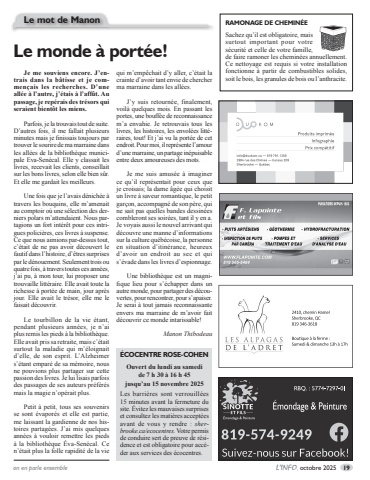 on en parle ensemble L%u2019INFO, octobre 2025 19Le mot de ManonLe monde %u00e0 port%u00e9e!Je me souviens encore. J%u2019entrais dans la b%u00e2tisse et je commen%u00e7ais les recherches. D%u2019une all%u00e9e %u00e0 l%u2019autre, j%u2019%u00e9tais %u00e0 l%u2019aff%u00fbt. Au passage, je rep%u00e9rais des tr%u00e9sors qui seraient bient%u00f4t les miens.Parfois, je la trouvais tout de suite. D%u2019autres fois, il me fallait plusieurs minutes mais je finissais toujours par trouver le sourire de ma marraine dans les all%u00e9es de la biblioth%u00e8que municipale Eva-Sen%u00e9cal. Elle y classait les livres, recevait les clients, conseillait sur les bons livres, selon elle bien s%u00fbr. Et elle me gardait les meilleurs. Une fois que je l%u2019avais d%u00e9nich%u00e9e %u00e0 travers les bouquins, elle m%u2019amenait au comptoir o%u00f9 une s%u00e9lection des derniers polars m%u2019attendaient. Nous partagions un fort int%u00e9r%u00eat pour ces intrigues polici%u00e8res, ces livres %u00e0 suspense. Ce que nous aimions par-dessus tout, c%u2019%u00e9tait de ne pas avoir d%u00e9couvert le fautif dans l%u2019histoire, d%u2019%u00eatres surprises par le d%u00e9nouement. Seulement trois ou quatre fois, %u00e0 travers toutes ces ann%u00e9es, j%u2019ai pu, %u00e0 mon tour, lui proposer une trouvaille litt%u00e9raire. Elle avait toute la richesse %u00e0 port%u00e9e de main, jour apr%u00e8s jour. Elle avait le tr%u00e9sor, elle me le faisait d%u00e9couvrir. Le tourbillon de la vie %u00e9tant, pendant plusieurs ann%u00e9es, je n%u2019ai plus remis les pieds %u00e0 la biblioth%u00e8que. Elle avait pris sa retraite, mais c%u2019%u00e9tait surtout la maladie qui m%u2019%u00e9loignait d%u2019elle, de son esprit. L%u2019Alzheimer s%u2019%u00e9tant empar%u00e9 de sa m%u00e9moire, nous ne pouvions plus partager sur cette passion des livres. Je lui lisais parfois des passages de ses auteurs pr%u00e9f%u00e9r%u00e9s mais la magie n%u2019op%u00e9rait plus. Petit %u00e0 petit, tous ses souvenirs se sont %u00e9vapor%u00e9s et elle est partie, me laissant la gardienne de nos histoires partag%u00e9es. J%u2019ai mis quelques ann%u00e9es %u00e0 vouloir remettre les pieds %u00e0 la biblioth%u00e8que %u00c9va-Sen%u00e9cal. Ce n%u2019%u00e9tait plus la folle rapidit%u00e9 de la vie qui m%u2019emp%u00eachait d%u2019y aller, c%u2019%u00e9tait la crainte d%u2019avoir tant envie de chercher ma marraine dans les all%u00e9es. J%u2019y suis retourn%u00e9e, finalement, voil%u00e0 quelques mois. En passant les portes, une bouff%u00e9e de reconnaissance m%u2019a envahie. Je retrouvais tous les livres, les histoires, les envol%u00e9es litt%u00e9raires, tout! Et j%u2019ai vu la port%u00e9e de cet endroit. Pour moi, il repr%u00e9sente l%u2019amour d%u2019une marraine, un partage in%u00e9puisable entre deux amoureuses des mots. Je me suis amus%u00e9e %u00e0 imaginer ce qu%u2019il repr%u00e9sentait pour ceux que je croisais; la dame %u00e2g%u00e9e qui choisit un livre %u00e0 saveur romantique, le petit gar%u00e7on, accompagn%u00e9 de son p%u00e8re, qui ne sait pas quelles bandes dessin%u00e9es combleront ses soir%u00e9es, tant il y en a. Je voyais aussi le nouvel arrivant qui d%u00e9couvre une manne d%u2019informations sur la culture qu%u00e9b%u00e9coise, la personne en situation d%u2019itin%u00e9rance, heureux d%u2019avoir un endroit au sec et qui s%u2019%u00e9vade dans les livres d%u2019espionnage. Une biblioth%u00e8que est un magnifique lieu pour s%u2019%u00e9chapper dans un autre monde, pour partager des d%u00e9couvertes, pour rencontrer, pour s%u2019apaiser. Je serai %u00e0 tout jamais reconnaissante envers ma marraine de m%u2019avoir fait d%u00e9couvrir ce monde intarissable!Manon ThibodeauRAMONAGE DE CHEMIN%u00c9ESachez qu%u2019il est obligatoire, mais surtout important pour votre s%u00e9curit%u00e9 et celle de votre famille, de faire ramoner les chemin%u00e9es annuellement. Ce nettoyage est requis si votre installation fonctionne %u00e0 partir de combustibles solides, soit le bois, les granules de bois ou l%u2019anthracite.%u00c9COCENTRE ROSE-COHENOuvert du lundi au samedide 7 h 30 %u00e0 16 h 45jusqu%u2019au 15 novembre 2025Les barri%u00e8res sont verrouill%u00e9es 15 minutes avant la fermeture du site. %u00c9vitez les mauvaises surprises et consultez les mati%u00e8res accept%u00e9es avant de vous y rendre : sherbrooke.ca/ecocentres. Votre permis de conduire sert de preuve de r%u00e9sidence et est obligatoire pour acc%u00e9der aux services des %u00e9cocentres.