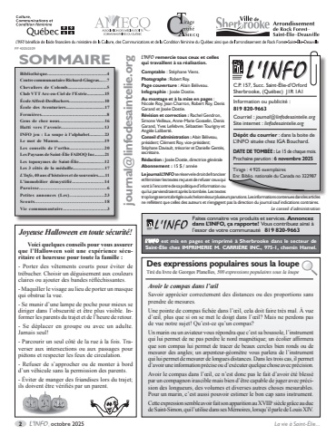 2 L%u2019INFO, octobre 2025 La vie %u00e0 Saint-%u00c9lie...L%u2019INFO remercie tous ceux et celles qui travaillent %u00e0 sa r%u00e9alisation.Comptable : St%u00e9phane Viens.Photographe : Robert Roy.Page couverture : Alain B%u00e9liveau.Infographie : Jos%u00e9e Dostie. Au montage et %u00e0 la mise en pages : Nicole Roy, Jean Charron, Robert Roy, Denis Garand et Jos%u00e9e Dostie.R%u00e9vision et correction : Rachel Gendron, Simone Veilleux, Anne-Marie Gosselin, Denis Garand, Yves Lefebvre, S%u00e9bastien Tourigny et Ang%u00e8le Lalibert%u00e9.Conseil d%u2019administration : Alain B%u00e9liveau, pr%u00e9sident; Cl%u00e9ment Roy, vice-pr%u00e9sident; St%u00e9phane Daviault, tr%u00e9sorier et Danielle Gent%u00e8s, secr%u00e9taire.R%u00e9daction : Jos%u00e9e Dostie, directrice g%u00e9n%u00e9raleAbonnement : 15 $ / ann%u00e9eLe journal L%u2019INFO se r%u00e9serve le droit de franciser et f%u00e9miniser les textes re%u00e7us et de refuser ceux qui vont %u00e0 l%u2019encontre de sa politique d%u2019information ou qui lui parviendraient apr%u00e8s la tomb%u00e9e. Les textes trop longs seront abr%u00e9g%u00e9s ou %u00e9chelonn%u00e9s sur plusieurs parutions. Les informations contenues dans les articles ne refl%u00e8tent que celles des auteurs et n%u2019engagent pas la direction du journal sauf indications contraires.Le conseil d%u2019administrationSOMMAIREBiblioth%u00e8que.............................................4Centre communautaire Richard-Gingras...%u20267Chevaliers de Colomb...............................5Club VTT Arc-en-Ciel de l%u2019Estrie...............15%u00c9cole Alfred-DesRochers...............................10%u00c9cole des Aventuriers...............................17Fermi%u00e8res.................................................8Gens de chez nous.................................%u202616Ha%u00efti vers l%u2019avenir................................13INFO jeu : La soupe %u00e0 l%u2019alphabet.........%u202623Le mot de Manon..................................%u202619Les conseils de l%u2019ortho.......................%u202620Les Paysans de Saint-%u00c9lie FADOQ Inc.........21Les toponymes de Saint-%u00c9lie..................%u202612Les 3 c%u00f4t%u00e9s de la m%u00e9daille.......................%u202617L%u2019Info, 40 ans d%u2019histoires et de souvenirs......11L%u2019immobilier d%u00e9mystifi%u00e9.....................%u202614Paroisse..............................................6Petites annonces (Les)%u2026...................%u202623Scouts..............................................18Vie communautaire.................................3 PP 40050309C.P. 157, Succ. Saint-%u00c9lie-d%u2019OrfordSherbrooke, (Qu%u00e9bec) J1R 1A1Tirage : 4 925 exemplairesEnr. Biblio. nationale du Canada no 322987D%u00e9p%u00f4t du courrier : dans la boite de L%u2019INFO situ%u00e9e chez IGA Bouchard.DATE DE TOMB%u00c9E : Le 15 de chaque mois.Prochaine parution : 6 novembre 2025Information ou publicit%u00e9 :819 820-9663Courriel : journal@linfodesaintelie.orgSite internet : linfodesaintelie.org journal@linfodesaintelie.orgFaites connaitre vos produits et services. Annoncez dans L%u2019INFO, %u00e7a rapporte! Vous contribuez ainsi %u00e0 l%u2019essor de votre communaut%u00e9 819 820-9663L%u2019INFO est mis en pages et imprim%u00e9 %u00e0 Sherbrooke dans le secteur de Saint-%u00c9lie chez IMPRIMERIE M. CARRI%u00c8RE INC., 975-1, chemin Hamel.Avoir le compas dans l%u2019%u0153ilSavoir appr%u00e9cier correctement des distances ou des proportions sans prendre de mesures.Une pointe de compas fich%u00e9e dans l%u2019%u0153il, cela doit faire tr%u00e8s mal. %u00c0 vue d%u2019%u0153il, plus que si on se met le doigt dans l%u2019%u0153il? Mais ne perdons pas de vue notre sujet! Qu%u2019est-ce qu%u2019un compas?Un marin ou un aviateur vous r%u00e9pondra que c%u2019est sa boussole, l%u2019instrument qui lui permet de ne pas perdre le nord magn%u00e9tique; un %u00e9colier affirmera que son compas lui permet de tracer de beaux cercles bien ronds ou de mesurer des angles; un arpenteur-g%u00e9om%u00e8tre vous parlera de l%u2019instrument qui lui permet de mesurer de longues distances. Dans les trois cas, il permet d%u2019avoir une information pr%u00e9cise ou d%u2019ex%u00e9cuter quelque chose avec pr%u00e9cision.Avoir le compas dans l%u2019%u0153il, ce n%u2019est donc pas le fait d%u2019avoir %u00e9t%u00e9 bless%u00e9 par un compagnon irascible mais bien d%u2019%u00eatre capable de juger avec pr%u00e9cision des longueurs, des volumes et diverses autres choses mesurables. Pour un marin, c%u2019est aussi pouvoir estimer le bon cap sans instrument.Cette expression semble avoir fait son apparition au XVIIIe si%u00e8cle gr%u00e2ce au duc de Saint-Simon, qui l%u2019utilise dans ses M%u00e9moires, lorsqu%u2019il parle de Louis XIV.Des expressions populaires sous la loupeTir%u00e9 du livre de Georges Planelles, 500 expressions populaires sous la loupeJoyeuse Halloween en toute s%u00e9curit%u00e9!Voici quelques conseils pour vous assurer que l%u2019Halloween soit une exp%u00e9rience s%u00e9curitaire et heureuse pour toute la famille :- Porter des v%u00eatements courts pour %u00e9viter de tr%u00e9bucher. Choisir un d%u00e9guisement aux couleurs claires ou ajouter des bandes r%u00e9fl%u00e9chissantes.- Maquiller le visage au lieu de porter un masque qui obstrue la vue.- Se munir d%u2019une lampe de poche pour mieux se diriger dans l%u2019obscurit%u00e9 et %u00eatre plus visible. Informer les parents du trajet et de l%u2019heure de retour.- Se d%u00e9placer en groupe ou avec un adulte. Jamais seul!- Parcourir un seul c%u00f4t%u00e9 de la rue %u00e0 la fois. Traverser aux intersections ou aux passages pour pi%u00e9tons et respecter les feux de circulation.- Refuser de s%u2019approcher ou de monter %u00e0 bord d%u2019un v%u00e9hicule sans la permission des parents.- %u00c9viter de manger des friandises lors du trajet; ils doivent %u00eatre v%u00e9rifi%u00e9s par un parent.