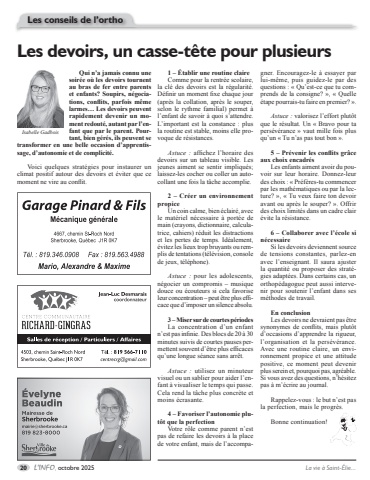 20 L%u2019INFO, octobre 2025 La vie %u00e0 Saint-%u00c9lie...Les conseils de l%u2019orthoLes devoirs, un casse-t%u00eate pour plusieursIsabelle GadboisQui n%u2019a jamais connu une soir%u00e9e o%u00f9 les devoirs tournent au bras de fer entre parents et enfants? Soupirs, n%u00e9gociations, conflits, parfois m%u00eame larmes%u2026 Les devoirs peuvent rapidement devenir un moment redout%u00e9, autant par l%u2019enfant que par le parent. Pourtant, bien g%u00e9r%u00e9s, ils peuvent se transformer en une belle occasion d%u2019apprentissage, d%u2019autonomie et de complicit%u00e9.Voici quelques strat%u00e9gies pour instaurer un climat positif autour des devoirs et %u00e9viter que ce moment ne vire au conflit.1 %u2013 %u00c9tablir une routine claireComme pour la rentr%u00e9e scolaire, la cl%u00e9 des devoirs est la r%u00e9gularit%u00e9. D%u00e9finir un moment fixe chaque jour (apr%u00e8s la collation, apr%u00e8s le souper, selon le rythme familial) permet %u00e0 l%u2019enfant de savoir %u00e0 quoi s%u2019attendre. L%u2019important est la constance : plus la routine est stable, moins elle provoque de r%u00e9sistances.Astuce : affichez l%u2019horaire des devoirs sur un tableau visible. Les jeunes aiment se sentir impliqu%u00e9s; laissez-les cocher ou coller un autocollant une fois la t%u00e2che accomplie.2 %u2013 Cr%u00e9er un environnement propiceUn coin calme, bien %u00e9clair%u00e9, avec le mat%u00e9riel n%u00e9cessaire %u00e0 port%u00e9e de main (crayons, dictionnaire, calculatrice, cahiers) r%u00e9duit les distractions et les pertes de temps. Id%u00e9alement, %u00e9vitez les lieux trop bruyants ou remplis de tentations (t%u00e9l%u00e9vision, console de jeux, t%u00e9l%u00e9phone).Astuce : pour les adolescents, n%u00e9gocier un compromis %u2013 musique douce ou %u00e9couteurs si cela favorise leur concentration %u2013 peut %u00eatre plus efficace que d%u2019imposer un silence absolu.3 %u2013 Miser sur de courtes p%u00e9riodesLa concentration d%u2019un enfant n%u2019est pas infinie. Des blocs de 20 %u00e0 30 minutes suivis de courtes pauses permettent souvent d%u2019%u00eatre plus efficaces qu%u2019une longue s%u00e9ance sans arr%u00eat.Astuce : utilisez un minuteur visuel ou un sablier pour aider l%u2019enfant %u00e0 visualiser le temps qui passe. Cela rend la t%u00e2che plus concr%u00e8te et moins %u00e9crasante.4 %u2013 Favoriser l%u2019autonomie plut%u00f4t que la perfectionVotre r%u00f4le comme parent n%u2019est pas de refaire les devoirs %u00e0 la place de votre enfant, mais de l%u2019accompagner. Encouragez-le %u00e0 essayer par lui-m%u00eame, puis guidez-le par des questions : %u00ab Qu%u2019est-ce que tu comprends de la consigne? %u00bb, %u00ab Quelle %u00e9tape pourrais-tu faire en premier? %u00bb.Astuce : valorisez l%u2019effort plut%u00f4t que le r%u00e9sultat. Un %u00ab Bravo pour ta pers%u00e9v%u00e9rance %u00bb vaut mille fois plus qu%u2019un %u00ab Tu n%u2019as pas tout bon %u00bb.5 %u2013 Pr%u00e9venir les conflits gr%u00e2ce aux choix encadr%u00e9sLes enfants aiment avoir du pouvoir sur leur horaire. Donnez-leur des choix : %u00ab Pr%u00e9f%u00e8res-tu commencer par les math%u00e9matiques ou par la lecture? %u00bb, %u00ab Tu veux faire ton devoir avant ou apr%u00e8s le souper? %u00bb. Offrir des choix limit%u00e9s dans un cadre clair %u00e9vite la r%u00e9sistance.6 %u2013 Collaborer avec l%u2019%u00e9cole si n%u00e9cessaireSi les devoirs deviennent source de tensions constantes, parlez-en avec l%u2019enseignant. Il saura ajuster la quantit%u00e9 ou proposer des strat%u00e9gies adapt%u00e9es. Dans certains cas, un orthop%u00e9dagogue peut aussi intervenir pour soutenir l%u2019enfant dans ses m%u00e9thodes de travail.En conclusionLes devoirs ne devraient pas %u00eatre synonymes de conflits, mais plut%u00f4t d%u2019occasions d%u2019apprendre la rigueur, l%u2019organisation et la pers%u00e9v%u00e9rance. Avec une routine claire, un environnement propice et une attitude positive, ce moment peut devenir plus serein et, pourquoi pas, agr%u00e9able. Si vous avez des questions, n%u2019h%u00e9sitez pas %u00e0 m%u2019%u00e9crire au journal.Rappelez-vous : le but n%u2019est pas la perfection, mais le progr%u00e8s. Bonne continuation!