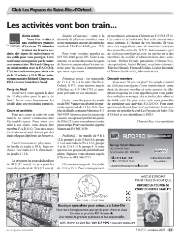on en parle ensemble L%u2019INFO, octobre 2025 21Les activit%u00e9s vont bon train...Ain%u00e9s avis%u00e9sVous %u00eates invit%u00e9s %u00e0 une conf%u00e9rence gratuite d%u2019environ 75 minutes traitant des fraudes aux ain%u00e9s, des signes de maltraitance et des outils pour vous prot%u00e9ger. Cette conf%u00e9rence est organis%u00e9e par le centre communautaire Richard-Gingras en collaboration avec la F.A.D.O.Q. C%u2019est un rendez-vous pour ain%u00e9s avis%u00e9s le 17 octobre %u00e0 13 h 30 au centre communautaire Richard-Gingras, au 4503, chemin Saint-Roch Nord.Party de No%u00eblInscrivez %u00e0 votre agenda la date du 13 d%u00e9cembre pour le party de No%u00ebl. Nous vous fournirons les d%u00e9tails dans une prochaine parution.Cours et activit%u00e9sTous nos cours et activit%u00e9s sont donn%u00e9s au centre communautaire Richard-Gingras. Pour vous inscrire %u00e0 ces cours, vous devez %u00eatre membre F.A.D.O.Q. Tous nos cours d%u2019entra%u00eenement sont donn%u00e9s par des kin%u00e9siologues dipl%u00f4m%u00e9s de Sercovie.Conditionnement physique :les lundis et jeudis %u00e0 10 h. Yoga sur chaise : les lundis %u00e0 11 h. %u00c9tirement :les jeudis %u00e0 11 h.Le prix pour les cours du lundi est de 70 $ (11 cours). Le prix pour les cours du jeudi est de 76 $ (12 cours).Zumba (Nouveau) : suite %u00e0 la demande de plusieurs membres, nous avons maintenant un cours de zumba les mardis de 13 h 45 %u00e0 14 h 45, prix : 76 $.Pour vous inscrire, appelez au 819 565-1066 poste 205. Suite %u00e0 une entente, ce seront d%u00e9sormais les gens de Sercovie qui prendront les inscriptions pour les cours d%u2019entra%u00eenement que nous organisons.P%u00e9tanque atout : les mercredis de 13 h %u00e0 16 h %u00e0 la salle SheffordOrford. S.V.P., vous inscrire aupr%u00e8s d%u2019H%u00e9l%u00e8ne au 819 346-3752 et aussi pour pr%u00e9venir de vos absences.Cartes : vous %u00eates joueur de canasta ou de 500? Venez vous divertir les mercredis apr%u00e8s-midi de 13 h %u00e0 16 h. Pour plus de d%u00e9tails, contactez Manon au 819 565-4439. Nouveau, pour les joueurs de canasta, vous pouvez profiter des jeudis de 18 h %u00e0 21 h pour vous adonner %u00e0 votre passe-temps. Pour vous inscrire, appelez Manon au 819 565-4439.Pickleball : les mardis de 9 h %u00e0 12 h, groupe 1 et de 13 h %u00e0 16 h, groupe 2. Les mercredis de 9 h %u00e0 12 h, groupe 3 et de 13 h %u00e0 16 h, groupe 4. %u00c0 noter que tous nos groupes de pickleball sont pleins. Signalez votre absence aupr%u00e8s d%u2019H%u00e9l%u00e8ne au 819 346-3752.Discussion espagnole : les jeudis de 13 h %u00e0 15 h. Pour renseignement et inscription, contactez Cl%u00e9ment au 819 563-5514.Ces cours et activit%u00e9s ont lieu cette saison mais nous sommes %u00e0 l%u2019%u00e9coute de vos besoins. Si vous avez des suggestions pour de nouveaux cours ou des nouvelles activit%u00e9s, S.V.P., faites-nous-en part au club.paysans@gmail.com ou parlez-en %u00e0 des membres du comit%u00e9 d%u2019administration dont voici la liste : H%u00e9l%u00e8ne Drouin, pr%u00e9sidente; Cl%u00e9ment Roy, vice-pr%u00e9sident; Andr%u00e9 B%u00e9land, secr%u00e9taire-tr%u00e9sorier; Th%u00e9r%u00e8se H%u00e9nault, Fernand Bolduc, Louise Tancr%u00e8de et Manon Guillemette, administrateurs.Devenir membreVous avez 50 ans ou plus? Un simple courriel au club.paysans@gmail.com mentionnant votre d%u00e9sir de devenir membre et votre num%u00e9ro de t%u00e9l%u00e9phone et quelqu%u2019un vous appellera pour vous parler des multiples avantages, des activit%u00e9s, des rabais et du faible co%u00fbt. De plus, votre carte vous permettra de participer aux activit%u00e9s F.A.D.O.Q. Pour ceux qui renouvelleront leur carte par Internet, bien vous assurer de sp%u00e9cifier le club Les Paysans de Saint-%u00c9lie d%u2019Orford et son identifiant le D033.Cl%u00e9ment Roy, vice-pr%u00e9sidentClub Les Paysans de Saint-%u00c9lie-d%u2019Orford