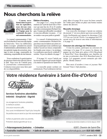 on en parle ensemble L%u2019INFO, octobre 2025 3Nous cherchons la rel%u00e8veVie communautaireJos%u00e9e DostieComme mentionn%u00e9 dans la parution de septembre, nous devons remplacer des membres de l%u2019%u00e9quipe pour la continuit%u00e9 du journal communautaire.Le journal communautaire L%u2019Infoest %u00e0 la recherche d%u2019une nouvelle %u00e9quipe de b%u00e9n%u00e9voles. Voici les diff%u00e9rentes t%u00e2ches %u00e0 occuper : pr%u00e9sident du conseil d%u2019administration, administrateurs, directeur g%u00e9n%u00e9ral, %u00e9quipe de correction, montage et mise en page, responsable du marketing, responsable du site Internet.Nous souhaitons la participation de plusieurs b%u00e9n%u00e9voles afin de relever le d%u00e9fi. Vous avez de l%u2019int%u00e9r%u00eat pour le journalisme communautaire? Contactez-nous pour nous faire part de vos disponibilit%u00e9s.%u00c9dition d%u2019octobreAux pages 5 et 7, voyez les informations sur l%u2019activit%u00e9 Saint-%u00c9lie-d%u2019Horreur qui aura lieu les 24 et 25 octobre au centre communautaire Richard-Gingras. Un parcours effroyable vous attend si vous osez affronter vos peurs%u2026 C%u2019est un rendez-vous pour petits et grands!Le conseil d%u2019administration du centre communautaire Richard-Gingras lance une invitation aux ain%u00e9s avis%u00e9s pour participer %u00e0 une conf%u00e9rence qui mettra l%u2019accent sur mieux comprendre les fraudes pour mieux s%u2019en prot%u00e9ger. La conf%u00e9rence aura lieu le vendredi 17 octobre. Voyez les d%u00e9tails %u00e0 la page 7.%u00c0 la page 14, voyez l%u2019article sur les travaux majeurs qui seront r%u00e9alis%u00e9s %u00e0 la station d%u2019%u00e9puration de Saint-%u00c9lie.La nouvelle ann%u00e9e scolaire est commenc%u00e9e. Pour la d%u00e9marrer du bon pied, allez %u00e0 la page 20 et voyez les bons conseils de l%u2019ortho pour mettre en place une bonne routine autour des devoirs.Nouvelle chroniqueUne nouvelle chronique s%u2019ajoute au contenu du journal. C%u2019est avec plaisir que nous accueillons Jos%u00e9e Guillemette qui signera la chronique Club VTT Arc-en-Ciel de l%u2019Estrie. Les amateurs de VTT seront ravis de trouver une mine d%u2019informations %u00e0 la page 15.Concours de coloriage de l%u2019Halloween%u00c0 tous les jeunes, participez au concours de coloriage %u00e0 la page 22 et courez la chance de gagner un tr%u00e8s beau prix gr%u00e2ce %u00e0 IGA Bouchard %u00e0 Saint-%u00c9lie! Nous demandons aux familles de ne pas se pr%u00e9senter chez IGA Bouchard pour le tirage. Les gagnants seront contact%u00e9s par t%u00e9l%u00e9phone. Bonne chance!Bon mois d%u2019octobre %u00e0 tous et joyeuse Halloween! Voici L%u2019Info fant%u00f4me%u2026