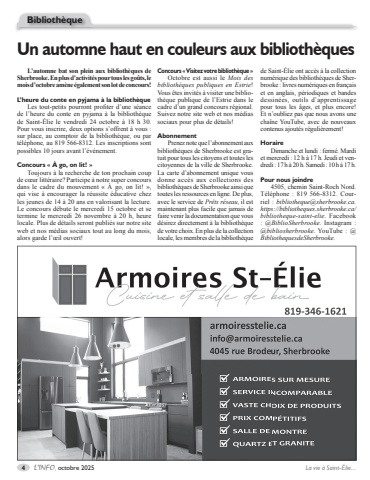 4 L%u2019INFO, octobre 2025 La vie %u00e0 Saint-%u00c9lie...Un automne haut en couleurs aux biblioth%u00e8quesL%u2019automne bat son plein aux biblioth%u00e8ques de Sherbrooke. En plus d%u2019activit%u00e9s pour tous les go%u00fbts, le mois d%u2019octobre am%u00e8ne %u00e9galement son lot de concours!L%u2019heure du conte en pyjama %u00e0 la biblioth%u00e8queLes tout-petits pourront profiter d%u2019une s%u00e9ance de l%u2019heure du conte en pyjama %u00e0 la biblioth%u00e8que de Saint-%u00c9lie le vendredi 24 octobre %u00e0 18 h 30. Pour vous inscrire, deux options s%u2019offrent %u00e0 vous : sur place, au comptoir de la biblioth%u00e8que, ou par t%u00e9l%u00e9phone, au 819 566-8312. Les inscriptions sont possibles 10 jours avant l%u2019%u00e9v%u00e9nement.Concours %u00ab %u00c0 go, on lit! %u00bbToujours %u00e0 la recherche de ton prochain coup de c%u0153ur litt%u00e9raire? Participe %u00e0 notre super concours dans le cadre du mouvement %u00ab %u00c0 go, on lit! %u00bb, qui vise %u00e0 encourager la r%u00e9ussite %u00e9ducative chez les jeunes de 14 %u00e0 20 ans en valorisant la lecture. Le concours d%u00e9bute le mercredi 15 octobre et se termine le mercredi 26 novembre %u00e0 20 h, heure locale. Plus de d%u00e9tails seront publi%u00e9s sur notre site web et nos m%u00e9dias sociaux tout au long du mois, alors garde l%u2019%u0153il ouvert!Concours %u00ab Visitez votre biblioth%u00e8que %u00bbOctobre est aussi le Mois des biblioth%u00e8ques publiques en Estrie! Vous %u00eates invit%u00e9s %u00e0 visiter une biblioth%u00e8que publique de l%u2019Estrie dans le cadre d%u2019un grand concours r%u00e9gional. Suivez notre site web et nos m%u00e9dias sociaux pour plus de d%u00e9tails!Abonnement Prenez note que l%u2019abonnement aux biblioth%u00e8ques de Sherbrooke est gratuit pour tous les citoyens et toutes les citoyennes de la ville de Sherbrooke. La carte d%u2019abonnement unique vous donne acc%u00e8s aux collections des biblioth%u00e8ques de Sherbrooke ainsi que toutes les ressources en ligne. De plus, avec le service de Pr%u00eats r%u00e9seau, il est maintenant plus facile que jamais de faire venir la documentation que vous d%u00e9sirez directement %u00e0 la biblioth%u00e8que de votre choix. En plus de la collection locale, les membres de la biblioth%u00e8que de Saint-%u00c9lie ont acc%u00e8s %u00e0 la collection num%u00e9rique des biblioth%u00e8ques de Sherbrooke : livres num%u00e9riques en fran%u00e7ais et en anglais, p%u00e9riodiques et bandes dessin%u00e9es, outils d%u2019apprentissage pour tous les %u00e2ges, et plus encore! Et n%u2019oubliez pas que nous avons une cha%u00eene YouTube, avec de nouveaux contenus ajout%u00e9s r%u00e9guli%u00e8rement!HoraireDimanche et lundi : ferm%u00e9. Mardi et mercredi : 12 h %u00e0 17 h. Jeudi et vendredi: 17 h %u00e0 20 h. Samedi: 10 h %u00e0 17 h.Pour nous joindre4505, chemin Saint-Roch Nord. T%u00e9l%u00e9phone : 819 566-8312. Courriel : bibliotheque@sherbrooke.ca. https://bibliotheques.sherbrooke.ca/bibliotheque-saint-elie. Facebook : @BiblioSherbrooke. Instagram : @bibliosherbrooke. YouTube : @BibliothequesdeSherbrooke.Biblioth%u00e8que