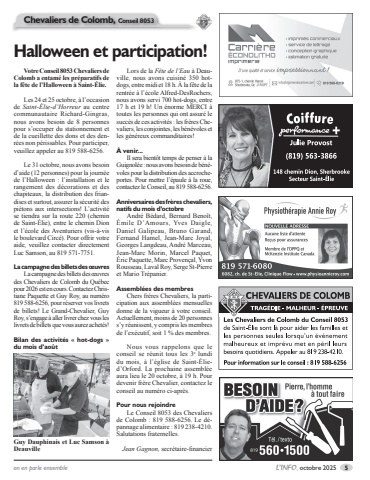 on en parle ensemble L%u2019INFO, octobre 2025 5Halloween et participation!Chevaliers de Colomb, Conseil 8053Votre Conseil 8053 Chevaliers de Colomb a entam%u00e9 les pr%u00e9paratifs de la f%u00eate de l%u2019Halloween %u00e0 Saint-%u00c9lie.Les 24 et 25 octobre, %u00e0 l%u2019occasion de Saint-%u00c9lie-d%u2019Horreur au centre communautaire Richard-Gingras, nous avons besoin de 8 personnes pour s%u2019occuper du stationnement et de la cueillette des dons et des denr%u00e9es non p%u00e9rissables. Pour participer, veuillez appeler au 819 588-6256.Le 31 octobre, nous avons besoin d%u2019aide (12 personnes) pour la journ%u00e9e de l%u2019Halloween : l%u2019installation et le rangement des d%u00e9corations et des chapiteaux, la distribution des friandises et surtout, assurer la s%u00e9curit%u00e9 des pi%u00e9tons aux intersections! L%u2019activit%u00e9 se tiendra sur la route 220 (chemin de Saint-%u00c9lie), entre le chemin Dion et l%u2019%u00e9cole des Aventuriers (vis-%u00e0-vis le boulevard Circ%u00e9). Pour offrir votre aide, veuillez contacter directement Luc Samson, au 819 571-7751.La campagne des billets des %u0153uvresLa campagne des billets des %u0153uvres des Chevaliers de Colomb du Qu%u00e9bec pour 2026 est en cours. Contactez Christiane Paquette et Guy Roy, au num%u00e9ro 819 588-6256, pour r%u00e9server vos livrets de billets! Le Grand-Chevalier, Guy Roy, s%u2019engage %u00e0 aller livrer chez vous les livrets de billets que vous aurez achet%u00e9s!Bilan des activit%u00e9s %u00ab hot-dogs %u00bb du mois d%u2019ao%u00fbtLors de la F%u00eate de l%u2019Eau %u00e0 Deauville, nous avons cuisin%u00e9 350 hotdogs, entre midi et 18 h. %u00c0 la f%u00eate de la rentr%u00e9e %u00e0 l%u2019%u00e9cole Alfred-DesRochers, nous avons servi 700 hot-dogs, entre 17 h et 19 h! Un %u00e9norme MERCI %u00e0 toutes les personnes qui ont assur%u00e9 le succ%u00e8s de ces activit%u00e9s: les fr%u00e8res Chevaliers, les conjointes, les b%u00e9n%u00e9voles et les g%u00e9n%u00e9reux commanditaires!%u00c0 venir...Il sera bient%u00f4t temps de penser %u00e0 la Guignol%u00e9e : nous avons besoin de b%u00e9n%u00e9voles pour la distribution des accrocheportes. Pour mettre l%u2019%u00e9paule %u00e0 la roue, contactez le Conseil, au 819 588-6256.Anniversaires des fr%u00e8res chevaliers, natifs du mois d%u2019octobreAndr%u00e9 B%u00e9dard, Bernard Beno%u00eet, %u00c9mile D%u2019Amours, Yves Daigle, Daniel Galipeau, Bruno Garand, Fernand Hamel, Jean-Marc Joyal, Georges Langdeau, Andr%u00e9 Marceau, Jean-Marc Morin, Marcel Paquet, %u00c9ric Paquette, Marc Proven%u00e7al, Yvon Rousseau, Laval Roy, Serge St-Pierre et Mario Tr%u00e9panier. Assembl%u00e9es des membresChers fr%u00e8res Chevaliers, la participation aux assembl%u00e9es mensuelles donne de la vigueur %u00e0 votre conseil. Actuellement, moins de 20 personnes s%u2019y r%u00e9unissent, y compris les membres de l%u2019ex%u00e9cutif, soit 1 % des membres.Nous vous rappelons que le conseil se r%u00e9unit tous les 3e lundi du mois, %u00e0 l%u2019%u00e9glise de Saint-%u00c9lied%u2019Orford. La prochaine assembl%u00e9e aura lieu le 20 octobre, %u00e0 19 h. Pour devenir fr%u00e8re Chevalier, contactez le conseil au num%u00e9ro ci-apr%u00e8s. Pour nous rejoindreLe Conseil 8053 des Chevaliers de Colomb : 819 588-6256. Le d%u00e9pannage alimentaire : 819 238-4210. Salutations fraternelles.Jean Gagnon, secr%u00e9taire-financierGuy Dauphinais et Luc Samson %u00e0 Deauville
