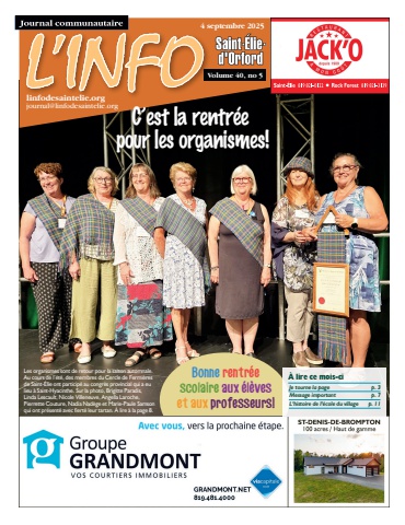 linfodesaintelie.orgjournal@linfodesaintelie.org4 septembre 2025C%u02bbest la rentr%u00e9e pour les organismes!Bonne rentr%u00e9escolaire aux %u00e9l%u00e8veset aux professeurs!Volume 40, no 5%u00c0 lire ce mois-cip. 3p. 7p. 11Je tourne la pageMessage importantL%u2019histoire de l%u2019%u00e9cole du villageLes organismes sont de retour pour la saison automnale. Au cours de l%u2019%u00e9t%u00e9, des membres du Cercle de Fermi%u00e8res de Saint-%u00c9lie ont particip%u00e9 au congr%u00e8s provincial qui a eu lieu %u00e0 Saint-Hyacinthe. Sur la photo, Brigitte Paradis, Linda Lescault, Nicole Villeneuve, Angella Laroche, Pierrette Couture, Nadia Nad%u00e8ge et Marie-Paule Samson qui ont pr%u00e9sent%u00e9 avec fiert%u00e9 leur tartan. %u00c0 lire %u00e0 la page 8.