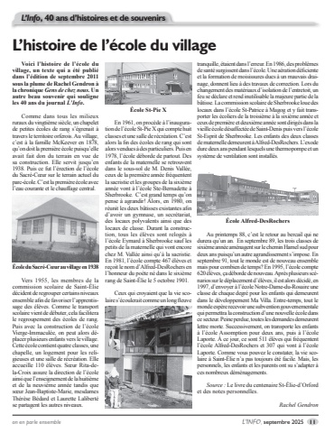 on en parle ensemble L%u2019INFO, septembre 2025 11L%u2019Info, 40 ans d%u2019histoires et de souvenirsL%u2019histoire de l%u2019%u00e9cole du villageVoici l%u2019histoire de l%u2019%u00e9cole du village, un texte qui a %u00e9t%u00e9 publi%u00e9 dans l%u2019%u00e9dition de septembre 2011 sous la plume de Rachel Gendron %u00e0 la chronique Gens de chez nous. Un autre beau souvenir qui souligne les 40 ans du journal L%u2019Info.Comme dans tous les milieux ruraux du vingti%u00e8me si%u00e8cle, un chapelet de petites %u00e9coles de rang s%u2019%u00e9grenait %u00e0 travers le territoire orferois. Au village, c%u2019est %u00e0 la famille McKeever en 1878, qu%u2019on doit la premi%u00e8re %u00e9cole puisqu%u2019elle avait fait don du terrain en vue de sa construction. Elle servit jusqu%u2019en 1938. Puis ce fut l%u2019%u00e9rection de l%u2019%u00e9cole du Sacr%u00e9-C%u0153ur sur le terrain actuel du parc-%u00e9cole. C%u2019est la premi%u00e8re %u00e9cole avec l%u2019eau courante et le chauffage central.Vers 1955, les membres de la commission scolaire de Saint-%u00c9lie d%u00e9cident de regrouper certains niveaux ensemble afin de favoriser l%u2019apprentissage des %u00e9l%u00e8ves. Comme le transport scolaire vient de d%u00e9buter, cela facilitera le regroupement des %u00e9coles de rang. Puis avec la construction de l%u2019%u00e9cole Vierge-Immacul%u00e9e, on peut alors d%u00e9placer plusieurs enfants vers le village. Cette %u00e9cole contient quatre classes, une chapelle, un logement pour les religieuses et une salle de r%u00e9cr%u00e9ation. Elle accueille 110 %u00e9l%u00e8ves. S%u0153ur Rita-dela-Croix assure la direction de l%u2019%u00e9cole ainsi que l%u2019enseignement de la huiti%u00e8me et de la neuvi%u00e8me ann%u00e9e tandis que s%u0153ur Jean-Baptiste-Marie, mesdames Th%u00e9r%u00e8se B%u00e9dard et Laurette Lalibert%u00e9 se partagent les autres niveaux.En 1961, on proc%u00e8de %u00e0 l%u2019inauguration de l%u2019%u00e9cole St-Pie X qui compte huit classes et une salle de r%u00e9cr%u00e9ation. C%u2019est alors la fin des %u00e9coles de rang qui sont alors vendues %u00e0 des particuliers. Puis en 1978, l%u2019%u00e9cole d%u00e9borde de partout. Des enfants de la maternelle se retrouvent dans le sous-sol de M. Denis Vall%u00e9e, ceux de la premi%u00e8re ann%u00e9e fr%u00e9quentent la sacristie et les groupes de la sixi%u00e8me ann%u00e9e vont %u00e0 l%u2019%u00e9cole Ste-Bernadette %u00e0 Sherbrooke. C%u2019est grand temps qu%u2019on pense %u00e0 agrandir! Alors, en 1980, on r%u00e9unit les deux b%u00e2tisses existantes afin d%u2019avoir un gymnase, un secr%u00e9tariat, des locaux polyvalents ainsi que des locaux de classe. Durant la construction, tous les %u00e9l%u00e8ves sont relog%u00e9s %u00e0 l%u2019%u00e9cole Eymard %u00e0 Sherbrooke sauf les petits de la maternelle qui vont encore chez M. Vall%u00e9e ainsi qu%u2019%u00e0 la sacristie. En 1981, l%u2019%u00e9cole compte 467 %u00e9l%u00e8ves et re%u00e7oit le nom d%u2019Alfred-DesRochers en l%u2019honneur du po%u00e8te n%u00e9 dans le sixi%u00e8me rang de Saint-%u00c9lie le 5 octobre 1901. Ceux qui croyaient que la vie scolaire s%u2019%u00e9coulerait comme un long fleuve tranquille, %u00e9taient dans l%u2019erreur. En 1986, des probl%u00e8mes de sant%u00e9 surgissent dans l%u2019%u00e9cole. Une a%u00e9ration d%u00e9ficiente et la formation de moisissures dues %u00e0 un mauvais drainage, donnent lieu %u00e0 des travaux de correction. Lors du changement des mat%u00e9riaux d%u2019isolation de l%u2019entretoit, un feu se d%u00e9clare et rend inutilisable la majeure partie de la b%u00e2tisse. La commission scolaire de Sherbrooke loue des locaux dans l%u2019%u00e9cole St-Patrice %u00e0 Magog et y fait transporter les %u00e9coliers de la troisi%u00e8me %u00e0 la sixi%u00e8me ann%u00e9e et ceux de premi%u00e8re et deuxi%u00e8me ann%u00e9e sont dirig%u00e9s dans la vieille %u00e9cole d%u00e9saffect%u00e9e de Saint-Denis puis vers l%u2019%u00e9cole St-Esprit de Sherbrooke. Les enfants des deux classes de maternelle demeurent %u00e0 Alfred-DesRochers. L%u2019exode dure deux ans pendant lesquels une thermopompe et un syst%u00e8me de ventilation sont install%u00e9s. Au printemps 88, c%u2019est le retour au bercail qui ne durera qu%u2019un an. En septembre 89, les trois classes de sixi%u00e8me ann%u00e9e am%u00e9nagent sur le chemin Hamel sud pour deux ans puisqu%u2019un autre agrandissement s%u2019impose. En septembre 91, tout le monde est de nouveau ensemble mais pour combien de temps? En 1995, l%u2019%u00e9cole compte 620 %u00e9l%u00e8ves, %u00e7a d%u00e9borde de nouveau. Apr%u00e8s plusieurs sc%u00e9narios sur le d%u00e9placement d%u2019%u00e9l%u00e8ves, il est alors d%u00e9cid%u00e9, en 1997, d%u2019envoyer %u00e0 l%u2019%u00e9cole Notre-Dame-du-Rosaire une classe de chaque degr%u00e9 pour les enfants qui demeurent dans le d%u00e9veloppement Ma Villa. Entre-temps, tout le monde esp%u00e8re recevoir une subvention gouvernementale qui permettra la construction d%u2019une nouvelle %u00e9cole dans ce secteur. Peine perdue, toutes les demandes demeurent lettre morte. Successivement, on transporte les enfants %u00e0 l%u2019%u00e9cole Assomption pour deux ans, puis %u00e0 l%u2019%u00e9cole Laporte. %u00c0 ce jour, ce sont 511 %u00e9l%u00e8ves qui fr%u00e9quentent l%u2019%u00e9cole Alfred-DesRochers et 307 qui vont %u00e0 l%u2019%u00e9cole Laporte. Comme vous pouvez le constater, la vie scolaire %u00e0 Saint-%u00c9lie n%u2019a pas toujours %u00e9t%u00e9 facile. Mais, les personnels, les enfants et les parents ont su s%u2019adapter %u00e0 ces nombreux d%u00e9m%u00e9nagements. Source : Le livre du centenaire St-%u00c9lie-d%u2019Orford et des notes personnelles.Rachel Gendron%u00c9cole du Sacr%u00e9-C%u0153ur au village en 1938%u00c9cole St-Pie X%u00c9cole Alfred-DesRochers