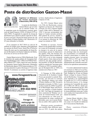 12 L%u2019INFO, septembre 2025 La vie %u00e0 Saint-%u00c9lie...Poste de distribution Gaston-Mass%u00e9G%u00e9rard Cot%u00e9 et Jean-Marie DuboisLes toponymes de Saint-%u00c9lieIng%u00e9nieur et d%u00e9fenseur du r%u00e9seau municipal d%u2019%u00e9lectricit%u00e9 (1904-2016)Le poste de distribution Gaston-Mass%u00e9, qui est situ%u00e9 sur le chemin Godin, est le quatri%u00e8me poste de distribution construit apr%u00e8s ceux de Saint-Fran%u00e7ois (1959), d%u2019Orford (1975) et Galt (1994). Il augmente la capacit%u00e9 du r%u00e9seau de distribution qui a atteint sa pleine capacit%u00e9 en 2018. Il sert %u00e0 convertir l%u2019%u00e9lectricit%u00e9 haute-tension de 120 kV achet%u00e9e d%u2019Hydro-Qu%u00e9bec %u00e0 de l%u2019%u00e9lectricit%u00e9 %u00e0 25 kV pour alimenter la client%u00e8le.Il est construit en 2017-2018 au co%u00fbt de 26 millions de dollars pour alimenter principalement les secteurs de Rock Forest, Saint-%u00c9lie-d%u2019Orford et Deauville ainsi que les municipalit%u00e9s de Saint-Denis-de-Brompton et de Sainte-Catherine-de-Hatley. Il est mis en service en f%u00e9vrier 2019. Gaston Mass%u00e9 est n%u00e9 en 1904 %u00e0 Sherbrooke. Il est le troisi%u00e8me des quatre enfants de Georgiana Gadbois Vandandaigue (1877-1960) et de Wilfrid T%u00e9lesphore Mass%u00e9 (1877-1905). Apr%u00e8s son cours classique au S%u00e9minaire Saint-Charles-Borrom%u00e9e (S%u00e9minaire de Sherbrooke depuis 1959) Gaston termine en 1931 son baccalaur%u00e9at en g%u00e9nie %u00e9lectrique %u00e0 l%u2019Universit%u00e9 McGill. Il commence sa carri%u00e8re d%u2019ing%u00e9nieur dans la firme sherbrookoise d%u2019ing%u00e9nierie Cr%u00e9peau et C%u00f4t%u00e9.En 1933, Gaston Mass%u00e9 entre %u00e0 la Ville de Sherbrooke comme ing%u00e9nieur au Service de l%u2019%u00e9lectricit%u00e9 et du gaz. En 1935, il %u00e9pouse Agathe Lemay (1906-1983) %u00e0 Montr%u00e9al. En 1938, il devient surintendant des lignes et l%u2019ann%u00e9e suivante surintendant g%u00e9n%u00e9ral du service. Quand ce service devient Hydro-Sherbrooke, il en assume la direction de 1963 jusqu%u2019%u00e0 sa retraite en 1969.Pendant sa carri%u00e8re, Gaston Mass%u00e9 a eu de grands d%u00e9fis %u00e0 surmonter %u00e0 cause de la demande croissante en %u00e9nergie %u00e0 la suite de la reprise %u00e9conomique suivant la d%u00e9pression des ann%u00e9es 1930, des besoins lors de la Deuxi%u00e8me Guerre mondiale de 1939-1945 et de la forte demande d%u2019apr%u00e8s-guerre. Ainsi, dans un but de conserver une plus grande autonomie possible, la Ville de Sherbrooke ach%u00e8te la centrale de l%u2019ancienne mine d%u2019Eustis en 1939, la centrale LaRocque de Bromptonville en 1949 et la centrale de la Paton en 1967.%u00c0 l%u2019%u00e9poque, la Ville ach%u00e8te de l%u2019%u00e9lectricit%u00e9 de la Southern Canada Power qui poss%u00e8de la centrale Sherbrooke, qui devient la centrale des Ab%u00e9naquis depuis son achat d%u2019Hydro-Qu%u00e9bec en 1988. Devant la demande croissante, la Ville n%u2019a pas le choix %u00e0 partir de 1940 d%u2019en acheter de la Shawinigan Water and Power, qui sera int%u00e9gr%u00e9e %u00e0 Hydro-Qu%u00e9bec en 1963. Une ligne de transport est alors construite de Windsor vers le poste de transformation Galt, qui sera d%u00e9mantel%u00e9 en 1964 pour la construction du centre commercial Belv%u00e9d%u00e8re, puis vers le poste Richelieu au centre-ville %u00e0 partir de 1950. Plusieurs postes secondaires sont install%u00e9s dans diff%u00e9rents quartiers en 1955. %u00c0 partir des ann%u00e9es 1920, le r%u00e9seau de distribution est prolong%u00e9 dans les municipalit%u00e9s avoisinantes %u00e0 la demande de conseils municipaux et m%u00eame de simples citoyens, mais c%u2019est surtout entre 1944 et 1955 qu%u2019il s%u2019%u00e9tend rapidement. %u00c0 partir de 1960, les %u00e9quipements des centrales sont am%u00e9lior%u00e9s et les op%u00e9rations automatis%u00e9es.Un centre administratif moderne est construit en 1964 sur la rue Roy, pour remplacer le b%u00e2timent du poste Galt. Pendant les 30 ans o%u00f9 Gaston Mass%u00e9 a dirig%u00e9 le r%u00e9seau d%u2019%u00e9lectricit%u00e9 de Sherbrooke, l%u2019%u00e9nergie requise pour r%u00e9pondre %u00e0 la consommation est pass%u00e9e de 53,5 %u00e0 423,6 millions de kilowatts-heures et la charge maximum de l%u2019ensemble des postes de 13 800 %u00e0 83 190 kw. Quant aux activit%u00e9s de distribution du gaz, elles sont interrompues en 1967 alors que le r%u00e9seau d%u00e9ficitaire ainsi que l%u2019usine sont vendus %u00e0 la Corporation de Gaz naturel du Qu%u00e9bec.Gaston Mass%u00e9 d%u00e9c%u00e8de %u00e0 Sherbrooke, le 20 mars 1991. Il donne son corps %u00e0 la Facult%u00e9 de m%u00e9decine de l%u2019Universit%u00e9 de Sherbrooke.Photo : courtoisie d%u2019HydroSherbrooke