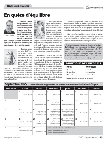 on en parle ensemble L%u2019INFO, septembre 2025 13Ha%u00efti vers l%u2019avenirJean CharronEn qu%u00eate d%u2019%u00e9quilibre1 2 3 4 5 67 8 9 10 11 12 1314 15 16 17 18 19 2021 22 23 24 25 26 2728 29 30Septembre 2025 calendrier des organismes au centre communautaire Richard-GingrasDimanche Lundi Mardi Mercredi Jeudi Vendredi SamediF%u00eate du Travail Biblio 12 h %u00e0 17 h Biblio 12 h %u00e0 17 h Biblio 17 h %u00e0 20 h Biblio 17 h %u00e0 20 h Biblio 10 h %u00e0 17 hBiblio 12 h %u00e0 17 hfermi%u00e8res rencontre 19 hBiblio 12 h %u00e0 17 httfermi%u00e8res couture 9 hBiblio 17 h %u00e0 20 hfermi%u00e8res atelier chandail 9 h Biblio 17 h %u00e0 20 h Biblio 10 h %u00e0 17 hActivit%u00e9 physique 10 h et 11 hBiblio 12 h %u00e0 17 hZumba 13 h 45Pickleball 9 h et 13 hBiblio 12 h %u00e0 17 h P%u00e9tanque atout 13 hJeux de cartes 13 hPickleball 9 h et 13 hfermi%u00e8res tricot 9 hBiblio 17 h %u00e0 20 hActivit%u00e9 physique 10 h et 11 hCarte canasta 18 hDiscussion espagnole 13 hfermi%u00e8res courtepointe 9 hBiblio 17 h %u00e0 20 h Biblio 10 h %u00e0 17 hActivit%u00e9 physique 10 h et 11 hBiblio 12 h %u00e0 17 hZumba 13 h 45Pickleball 9 h et 13 hBiblio 12 h %u00e0 17 hP%u00e9tanque atout 13 hJeux de cartes 13 hPickleball 9 h et 13 hfermi%u00e8res broderie 9 hBiblio 17 h %u00e0 20 hActivit%u00e9 physique 10 h et 11 hCarte canasta 18 hDiscussion espagnole 13 hfermi%u00e8res suivi chandail 9 hBiblio 17 h %u00e0 20 h Biblio 10 h %u00e0 17 hActivit%u00e9 physique 10 h et 11 h Zumba 13 h 45Pickleball 9 h et 13 hJourn%u00e9e internationale de la couche d%u2019ozone (16)Journ%u00e9e internationale de la paix (21)Journ%u00e9e mondiale du coeur (29)Enfant, pour nos premiers pas, nous recherchions l%u2019%u00e9quilibre pour avancer sans tomber. Nous sommes aussi, tous en qu%u00eate de justice et elle s%u2019illustre souvent par l%u2019image de deux plateaux en %u00e9quilibre. L%u2019%u00e9quilibre est une qu%u00eate sans fin, car vivre c%u2019est avancer.Lorsque nous sortons de l%u2019%u00e9picerie avec, dans une main, un kilo de bananes qu%u2019on aura pay%u00e9 2 $ et dans l%u2019autre, un kilo de cerises noires qu%u2019on aura pay%u00e9 8 $, nos mains illustrent le d%u00e9s%u00e9quilibre %u00e0 la source de multiples probl%u00e8mes. Les bananes viennent du Sud et les cerises du Nord de l%u2019Am%u00e9rique. La richesse au Nord, la pauvret%u00e9 au Sud.Devant les multiples d%u00e9s%u00e9quilibres : Russie/Ukraine; Isra%u00ebl/Palestine; Nous/Personnes itin%u00e9rantes, on se scandalise, on manifeste et on cherche comment am%u00e9liorer ce qui ne va pas. Il est %u00e9vident qu%u2019un individu ne peut pas changer le monde %u00e0 lui tout seul. Nous ne sommes que des grains de sable, mais nous pouvons, ensemble, former une plage qui s%u2019ouvre sur un oc%u00e9an de possibles.Solidarit%u00e9-Ha%u00efti en Estrie (S.H.E.) offre, depuis des ann%u00e9es, la possibilit%u00e9 d%u2019agir pour transformer le quotidien de la paysannerie du Plateau central. Au cours de son histoire, S.H.E. a soutenu des dizaines de projets. Il y a 10 ans, nous avons d%u00e9marr%u00e9 une Caisse populaire pour que commer%u00e7antes et agricultrices puissent avoir acc%u00e8s au cr%u00e9dit. Pour en profiter, elles doivent d%u2019abord ouvrir un compte d%u2019%u00e9pargne.Dans cette population pleine de potentiel, notre investissement initial de 800 000 gourdes est devenu, plusieurs millions de gourdes en circulation sous forme de petits pr%u00eats. Chacun de nos projets souhaite ainsi r%u00e9pondre %u00e0 cette qu%u00eate d%u2019%u00e9quilibre entre le Nord et le Sud.%u00ab La vie est un %u00e9quilibre entre retenir et laisser aller %u00bb, Rumi, po%u00e8te afghan. Ensemble, pour tenir la joie de l%u2019%u00e9quilibre, laissons aller un peu de notre richesse et transformons le visage d%u2019Ha%u00efti. Joignez nos rangs. Faites un ch%u00e8que %u00e0 l%u2019ordre du CSI que vous exp%u00e9diez %u00e0 Solidarit%u00e9-Ha%u00efti en Estrie, 147, rue Allard, Sherbrooke, QC. J1G 3X9 OU via : https://bit.ly/Solidarite_Estrie.Re%u00e7u pour l%u2019imp%u00f4t, 20 $ et plus. Page Facebook : fb.me/solidaritehaitiestrie. T%u00e9l. : 819 791-4745, Courriel : solidaritehaitiestrie@gmail.com.MOIS PARUTIONOctobre : 2 octobreNovembre : 6 novembreD%u00e9cembre : 4 d%u00e9cembrePas de parution en janvier et en ao%u00fbt.PARUTIONS DE L%u2019INFO 2025