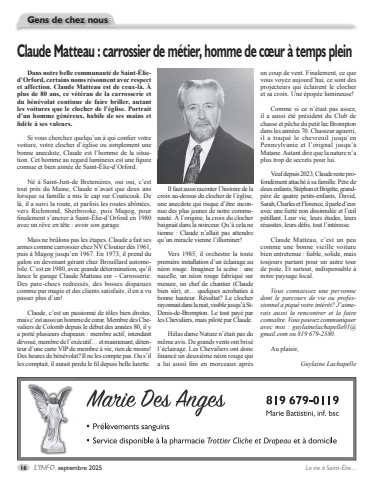 16 L%u2019INFO, septembre 2025 La vie %u00e0 Saint-%u00c9lie...Claude Matteau : carrossier de m%u00e9tier, homme de c%u0153ur %u00e0 temps pleinGens de chez nousDans notre belle communaut%u00e9 de Saint-%u00c9lied%u2019Orford, certains noms r%u00e9sonnent avec respect et affection. Claude Matteau est de ceux-l%u00e0. %u00c0 plus de 80 ans, ce v%u00e9t%u00e9ran de la carrosserie et du b%u00e9n%u00e9volat continue de faire briller, autant les voitures que le clocher de l%u2019%u00e9glise. Portrait d%u2019un homme g%u00e9n%u00e9reux, habile de ses mains et fid%u00e8le %u00e0 ses valeurs.Si vous cherchez quelqu%u2019un %u00e0 qui confier votre voiture, votre clocher d%u2019%u00e9glise ou simplement une bonne anecdote, Claude est l%u2019homme de la situation. Cet homme au regard lumineux est une figure connue et bien aim%u00e9e de Saint-%u00c9lie-d%u2019Orford.N%u00e9 %u00e0 Saint-Just-de Breteni%u00e8res, oui oui, c%u2019est tout pr%u00e8s du Maine, Claude n%u2019avait que deux ans lorsque sa famille a mis le cap sur Coaticook. De l%u00e0, il a suivi la route, et parfois les routes ab%u00eem%u00e9es, vers Richmond, Sherbrooke, puis Magog, pour finalement s%u2019ancrer %u00e0 Saint-%u00c9lie-d%u2019Orford en 1980 avec un r%u00eave en t%u00eate : avoir son garage.Mais ne br%u00fblons pas les %u00e9tapes. Claude a fait ses armes comme carrossier chez NV Cloutier d%u00e8s 1961, puis %u00e0 Magog jusqu%u2019en 1967. En 1973, il prend du galon en devenant g%u00e9rant chez Brouillard automobile. C%u2019est en 1980, avec grande d%u00e9termination, qu%u2019il lance le garage Claude Matteau enr %u2013 Carrosserie. Des pare-chocs redress%u00e9s, des bosses disparues comme par magie et des clients satisfaits, il en a vu passer plus d%u2019un!Claude, c%u2019est un passionn%u00e9 de t%u00f4les bien droites, mais c%u2019est aussi un homme de c%u0153ur. Membre des Chevaliers de Colomb depuis le d%u00e9but des ann%u00e9es 80, il y a port%u00e9 plusieurs chapeaux : membre actif, intendant d%u00e9vou%u00e9, membre de l%u2019ex%u00e9cutif%u2026 et maintenant, d%u00e9tenteur d%u2019une carte VIP de membre %u00e0 vie, rien de moins! Des heures de b%u00e9n%u00e9volat? Il ne les compte pas. Ou s%u2019il les comptait, il aurait perdu le fil depuis belle lurette.Il faut aussi raconter l%u2019histoire de la croix au-dessus du clocher de l%u2019%u00e9glise, une anecdote qui risque d%u2019%u00eatre inconnue des plus jeunes de notre communaut%u00e9. %u00c0 l%u2019origine, la croix du clocher baignait dans la noirceur. Qu%u2019%u00e0 cela ne tienne : Claude n%u2019allait pas attendre qu%u2019un miracle vienne l%u2019illuminer! Vers 1985, il orchestre la toute premi%u00e8re installation d%u2019un %u00e9clairage au n%u00e9on rouge. Imaginez la sc%u00e8ne : une nacelle, un n%u00e9on rouge fabriqu%u00e9 sur mesure, un chef de chantier (Claude bien s%u00fbr), et%u2026 quelques acrobaties %u00e0 bonne hauteur. R%u00e9sultat? Le clocher rayonnait dans la nuit, visible jusqu%u2019%u00e0 StDenis-de-Brompton. Le tout pay%u00e9 par les Chevaliers, mais pilot%u00e9 par Claude. H%u00e9las dame Nature n%u2019%u00e9tait pas du m%u00eame avis. De grands vents ont bris%u00e9 l%u2019%u00e9clairage. Les Chevaliers ont donc financ%u00e9 un deuxi%u00e8me n%u00e9on rouge qui a lui aussi fini en morceaux apr%u00e8s un coup de vent. Finalement, ce que vous voyez aujourd%u2019hui, ce sont des projecteurs qui %u00e9clairent le clocher et sa croix. Une %u00e9pop%u00e9e lumineuse!Comme si ce n%u2019%u00e9tait pas assez, il a aussi %u00e9t%u00e9 pr%u00e9sident du Club de chasse et p%u00eache du petit lac Brompton dans les ann%u00e9es 70. Chasseur aguerri, il a traqu%u00e9 le chevreuil jusqu%u2019en Pennsylvanie et l%u2019orignal jusqu%u2019%u00e0 Matane. Autant dire que la nature n%u2019a plus trop de secrets pour lui.Veuf depuis 2023, Claude reste profond%u00e9ment attach%u00e9 %u00e0 sa famille. P%u00e8re de deux enfants, St%u00e9phan et Brigitte, grandp%u00e8re de quatre petits-enfants, David, Sarah, Charles et Florence, il parle d%u2019eux avec une fiert%u00e9 non dissimul%u00e9e et l%u2019%u0153il p%u00e9tillant. Leur vie, leurs %u00e9tudes, leurs r%u00e9ussites, leurs d%u00e9fis, tout l%u2019int%u00e9resse.Claude Matteau, c%u2019est un peu comme une bonne vieille voiture bien entretenue : fiable, solide, mais toujours partant pour un autre tour de piste. Et surtout, indispensable %u00e0 notre paysage local.Vous connaissez une personne dont le parcours de vie ou professionnel a piqu%u00e9 votre int%u00e9r%u00eat? J%u2019aimerais aussi la rencontrer et la faire conna%u00eetre. Vous pouvez communiquer avec moi : guylainelachapelle01@gmail.com ou 819 679-2580.Au plaisir,Guylaine Lachapelle