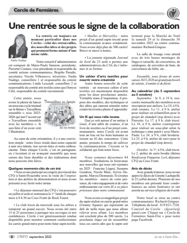 8 L%u2019INFO, septembre 2025 La vie %u00e0 Saint-%u00c9lie...La rentr%u00e9e est toujours un moment particulier dans nos Cercles : celui des retrouvailles, des nouvelles id%u00e9es et des projets qui prennent forme autour d%u2019une m%u00eame table. Notre conseil d%u2019administration est compos%u00e9 de Marie-Paule Samson, pr%u00e9sidente; Pierrette Couture, vice-pr%u00e9sidente et responsable du comit%u00e9 actions communautaires; Brigitte Paradis, secr%u00e9taire; Nicole Villeneuve, tr%u00e9sori%u00e8re; Nadia Nad%u00e8ge, conseill%u00e8re 1 et responsable du comit%u00e9 communications; Linda Lescault, conseill%u00e8re 2 et responsable du comit%u00e9 arts textiles ainsi que Denyse C%u00f4t%u00e9, responsable du comit%u00e9 recrutement.Cette ann%u00e9e, nous avons le plaisir de lancer un nouveau cycle triennal sur le th%u00e8me %u00ab Travaillons ensemble %u00bb, avec 2025-2026 qui met l%u2019accent sur %u00ab Travaillons ensemble avec les membres %u00bb. Je suis fi%u00e8re d%u2019en avoir cr%u00e9%u00e9 l%u2019illustration.Au c%u0153ur de cette orientation, il y a une conviction simple : notre force r%u00e9side dans notre capacit%u00e9 %u00e0 unir nos talents, nos savoir-faire et notre enthousiasme. Dans chaque Cercle, c%u2019est en partageant, en s%u2019%u00e9coutant et en avan%u00e7ant ensemble que nous cr%u00e9ons des liens durables et des r%u00e9alisations dont nous pouvons %u00eatre fi%u00e8res.Quelques moments-cl%u00e9s de cet %u00e9t%u00e9%u2022 Nous avons particip%u00e9 au congr%u00e8s provincial des CFQ %u00e0 Saint-Hyacinthe avec la visite de l%u2019exposition et des ateliers de d%u00e9monstration et nous avons pr%u00e9sent%u00e9 avec fiert%u00e9 notre tartan. %u2022 Le d%u00e9jeuner mensuel des CFQ s%u2019est poursuivi en juillet et ao%u00fbt et continuera le 1er lundi de chaque mois %u00e0 8 h 30 au Coco Frutti de Rock Forest.%u2022 Le club tricot du mercredi sous les arbres a remport%u00e9 un grand succ%u00e8s. Nous avons %u00e9t%u00e9 entre 15 et 25 personnes %u00e0 partager nos ouvrages et nos confidences. C%u00e9cile s%u2019est g%u00e9n%u00e9reusement rendue disponible pour montrer comment confectionner les carr%u00e9s grand-m%u00e8re pour notre futur sapin textile.Cercle de Fermi%u00e8resUne rentr%u00e9e sous le signe de la collaborationNadia Nad%u00e8ge%u2022 Mailles et Merveilles : notre projet d%u2019un grand sapin tricot%u00e9 pour la communaut%u00e9 avance rondement. Nous avons d%u00e9j%u00e0 plus de 500 carr%u00e9s! Bravo et merci %u00e0 toutes.%u2022 La journ%u00e9e r%u00e9gionale Journal de bord du 23 ao%u00fbt a permis aux administratrices du CAL de s%u2019informer et se former.Un cahier d%u2019arts textiles pour nourrir notre cr%u00e9ativit%u00e9Autre bonne nouvelle de cette rentr%u00e9e : un nouveau cahier d%u2019arts textiles est maintenant disponible pour les deux prochaines ann%u00e9es. V%u00e9ritable mine d%u2019inspiration, il propose des mod%u00e8les, des techniques et des id%u00e9es qui sauront stimuler notre cr%u00e9ativit%u00e9 et notre plaisir d%u2019apprendre.Un fil qui nous relie toutesQue ce soit autour d%u2019un m%u00e9tier %u00e0 tisser, d%u2019une table de couture, d%u2019un livre de recettes ou d%u2019un projet communautaire, notre Cercle est avant tout un lieu o%u00f9 les liens humains se tissent au fil des rencontres. Cette ann%u00e9e, prenons le temps de cultiver la communication, l%u2019%u00e9coute et la solidarit%u00e9 qui font notre force.Nous sommes d%u00e9sormais 84 membres. Souhaitons la bienvenue aux nouvelles qui nous ont rejointes en 2025 : Francine L%u00e9gar%u00e9, Suzanne Gendron, Nicole Blais, Sylvie Duquette, Maryse Desmarais. Et %u00e0 toutes les membres : merci de votre pr%u00e9sence, de votre engagement et de votre enthousiasme car votre fil a sa place pr%u00e9cieuse dans notre communaut%u00e9.Nous avons ce magnifique projet du sapin r%u00e9alis%u00e9 en carr%u00e9s grand-m%u00e8re (Granny Square) qui repr%u00e9sente un d%u00e9fi de taille mais que nous allons relever avec allant. Les membres ont crochet%u00e9 plus de 500 carr%u00e9s. La prochaine %u00e9tape est de rassembler tous ces carr%u00e9s afin que le sapin soit termin%u00e9 pour le March%u00e9 de No%u00ebl le samedi 29 et le dimanche 30 novembre 2025 au centre communautaire Richard-Gingras.La salle de tissage vous attend avec de tr%u00e8s beaux montages de linges %u00e0 vaisselle, de couvertures, de catalognes, de serviettes de bain, de couvertures de b%u00e9b%u00e9, etc%u2026Ensemble, nous ferons de notre saison 2025-2026 un grand patchwork de talents, d%u2019amiti%u00e9 et de fiert%u00e9.Au calendrier (du 5 septembre au 5 octobre)Septembre : le 9, %u00e0 19 h, rencontre mensuelle des membres avec inscription aux ateliers. Le 10, %u00e0 9 h, club couture. Le 11, %u00e0 9 h, atelier pour r%u00e9aliser un %u00e9chantillon pour le projet de chandail (top down) avec Pierrette. Le 17, %u00e0 9 h, club tricot. Le 18, %u00e0 9 h, atelier courtepointe pour r%u00e9aliser un sous-plat selon la technique %u00ab nine patch %u00bb avec MariePaule. Le 24, %u00e0 9 h, club broderie. Le 25, %u00e0 9 h, atelier de suivi pour le projet de chandail (top down).Octobre : le 1er, %u00e0 9 h, club tricot. Le 2, atelier de carte brod%u00e9e (th%u00e8me floral) avec Fran%u00e7oise. Le 6, d%u00e9jeuner CFQ au Coco Frutti.Avis de d%u00e9c%u00e8sAvec grande tristesse, nous avons appris le d%u00e9c%u00e8s de Ginette Lachapelle le 23 juillet dernier. Plusieurs de nos membres ont pr%u00e9sent%u00e9 leurs condol%u00e9ances au salon fun%u00e9raire et ont assist%u00e9 au service religieux du 6 ao%u00fbt. Notre local se situe au centre communautaire Richard-Gingras. T%u00e9l%u00e9phone du local : 819 821-7326. Courriel du Cercle : cfqstelie@gmail.com. Cliquer sur %u00ab Cercle de Fermi%u00e8res Saint-%u00c9lie %u00bb pour notre page Facebook.